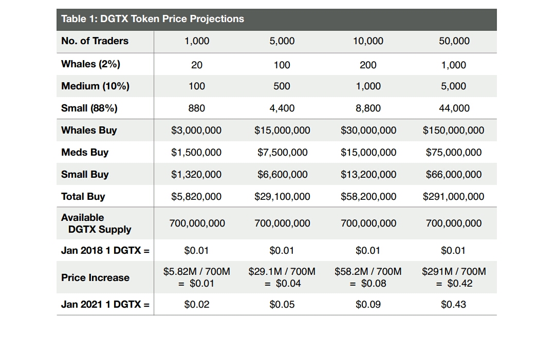 Assuming 2% of traders are big time buyers, who buy $150k worth of DGTX tokens, 10% are average traders that purchase $15k worth of DGTX tokens, and the rest are small traders that buy a total of $1500 of DGTX tokens, all over the initial 2 year period,