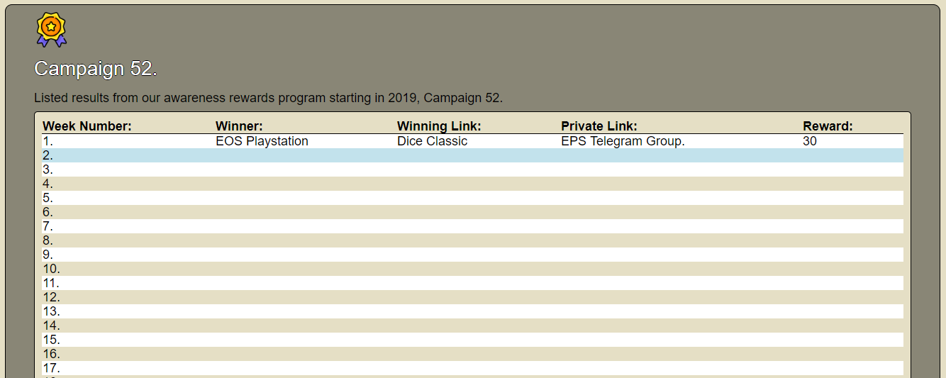 We're glad to announce the winner of the first week of our rewards campaign, Campaign 52.