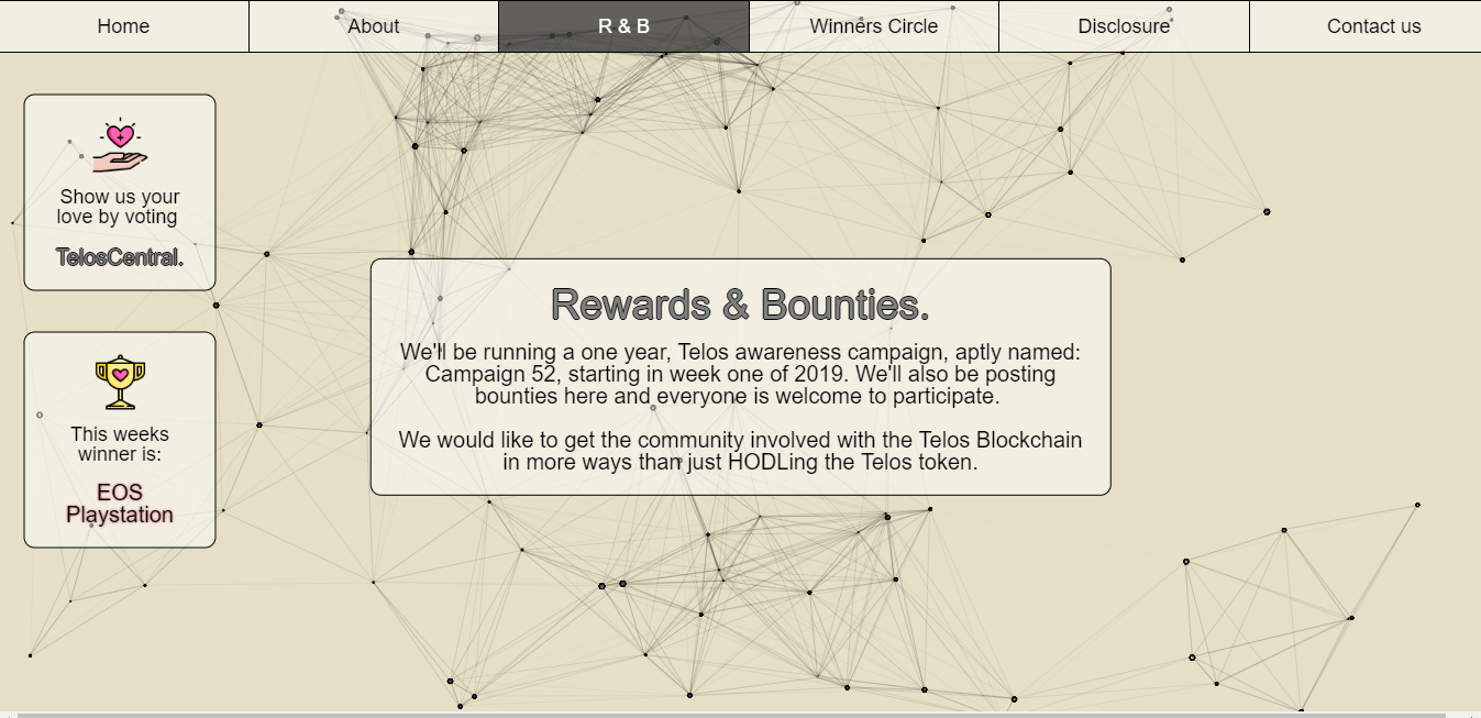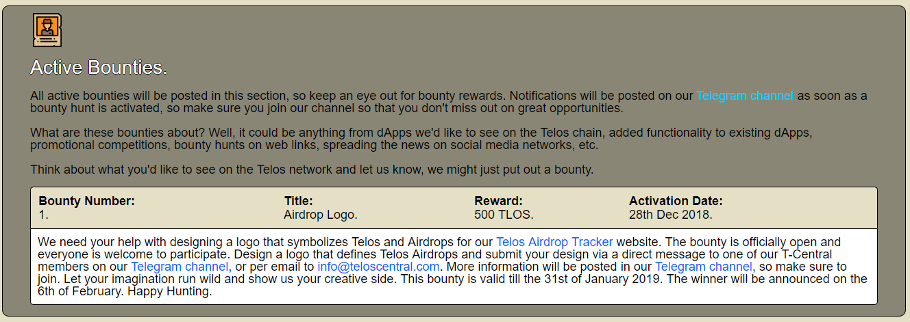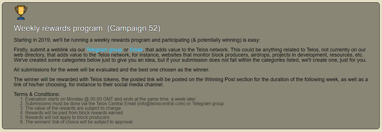 Campaign 52 was an idea that was part of Telos Central from the very beginning. We’ll be rewarding members of the community on a weekly basis for informing us about links and useful tools that are not currently part of our directory, as well as constructive feedback on how to improve our platform. Starting in January 2019 we’ll be running this reward campaign to the end of 2019, 52 weeks in total, hence “Campaign 52”.