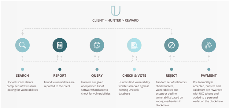 Uncloak is a unique tool which gives users the ability to cut through cyber jargon, understand, remediate and also resolve cyber security issues. Uncloak is an Artificial Intelligence (AI) based analytical tool for the intuitive, automated and seamless performance of security checks. Uncloak will make this unique cyber security available on a mass scale, at a lower cost and with simple end user interaction. Uncloak will create a decentralized, scalable, blockchain powered cyber security management solution which places emphasis on strength of the wider community to contribute to searching vulnerabilities through a blockchain based mechanism. Unlike other security platforms, Uncloak will be harnessing knowledge and expertise, aggregate it into a unique platform and then transform it into a service for end users to purchase. By using advanced AI technology to crawl the public and private internet in search of latest cyber security threats, Uncloak will build its own threat detection database.
