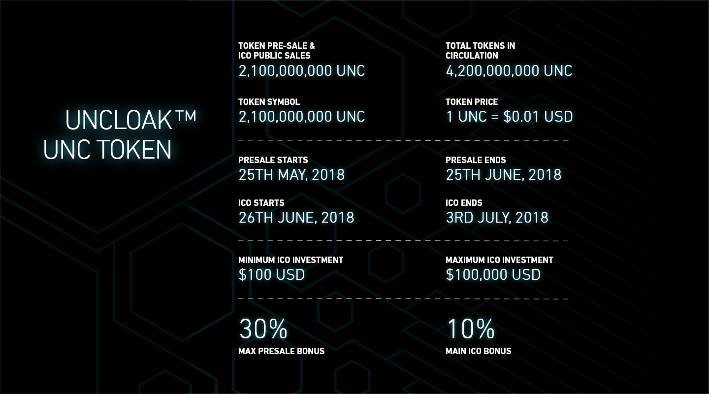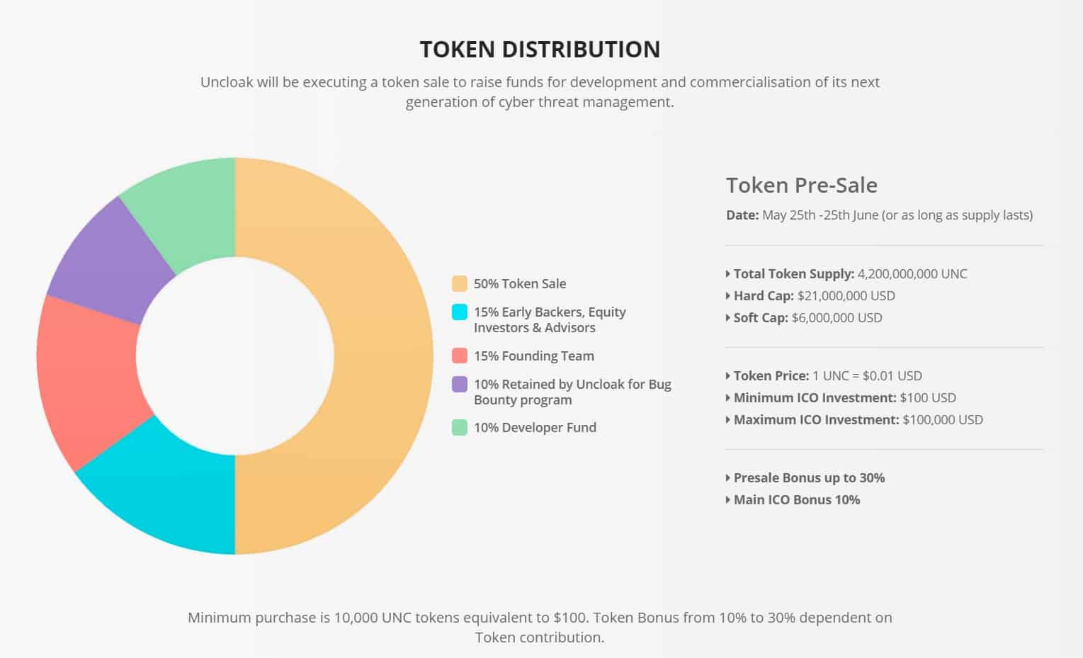 The Uncloak team will carry out a token sale so as to raise funds which will be used for development and commercialization of its next generation of cyber threat management. The Uncloak team will accept maximum amount of $21, 000, 000 USD and only ETH will be accepted. The token distribution of Uncloak is given as follows;