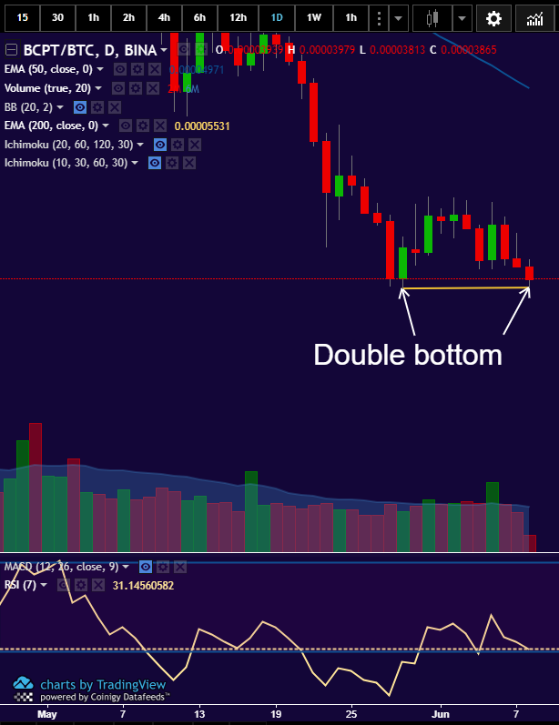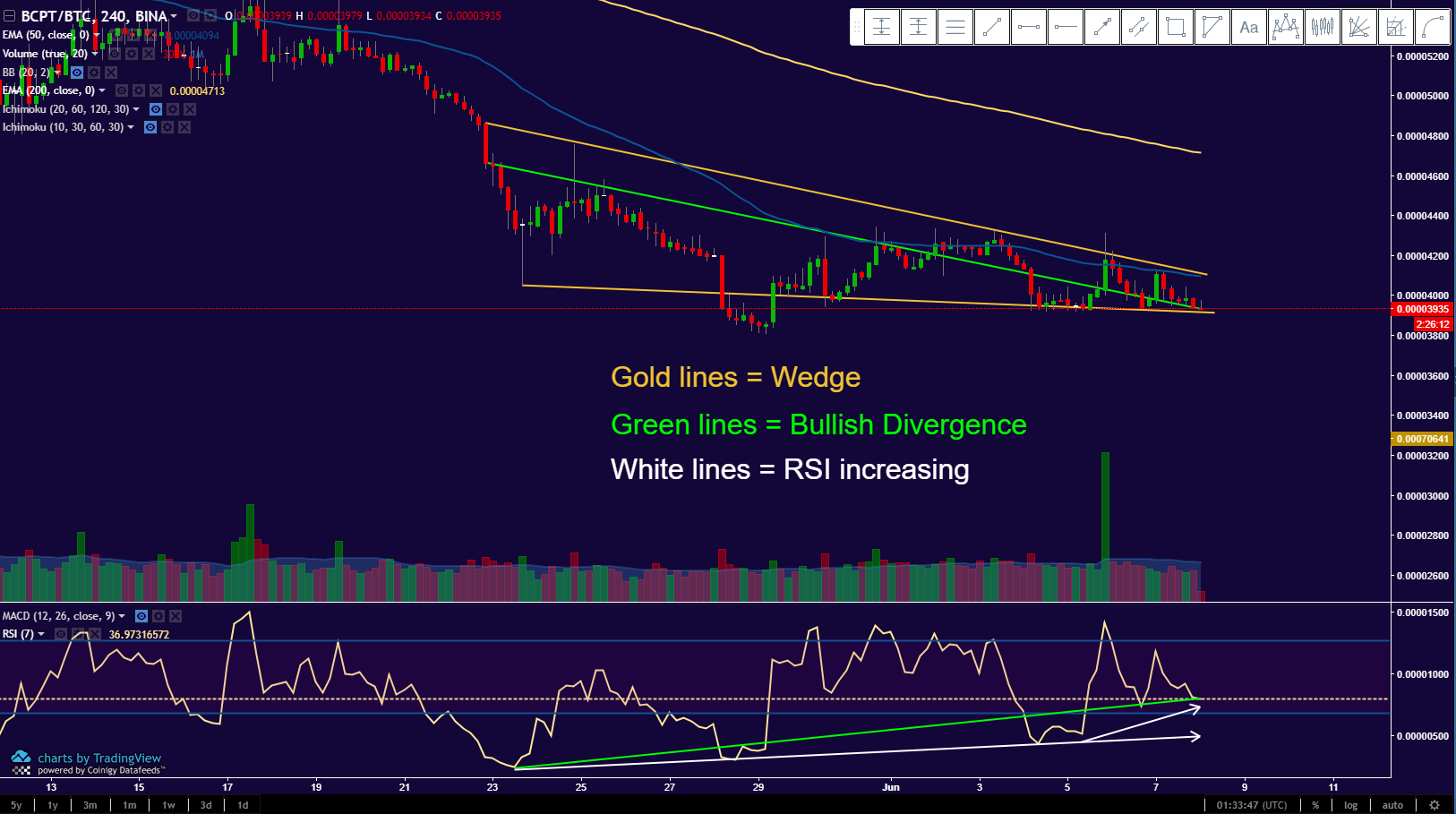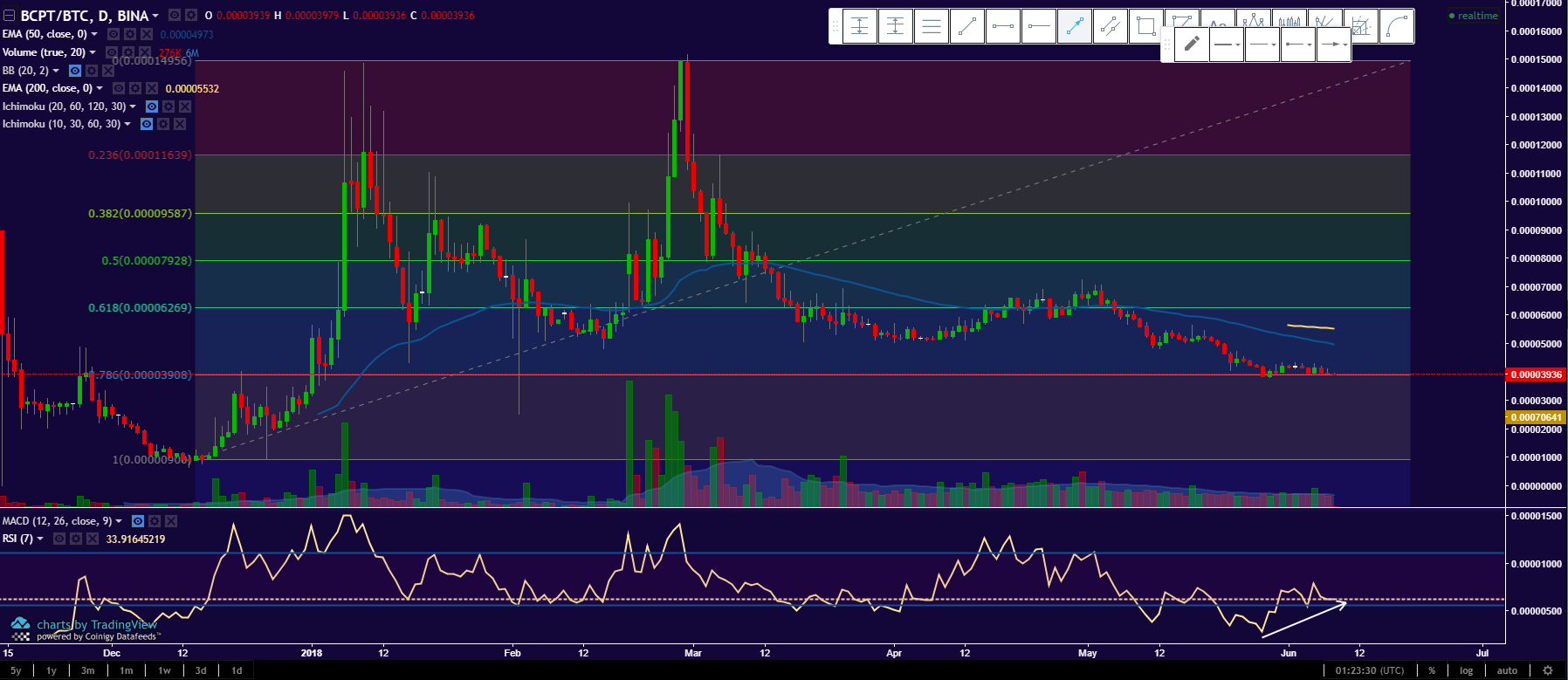 The .786 Fib almost always represents a good entry and as a bonus in BCPT's case happens to be sitting on a nice round psychological number of .00004 sats. At time of writing price is just above .000039 sats where I have made my own entry.