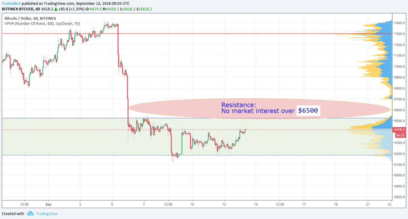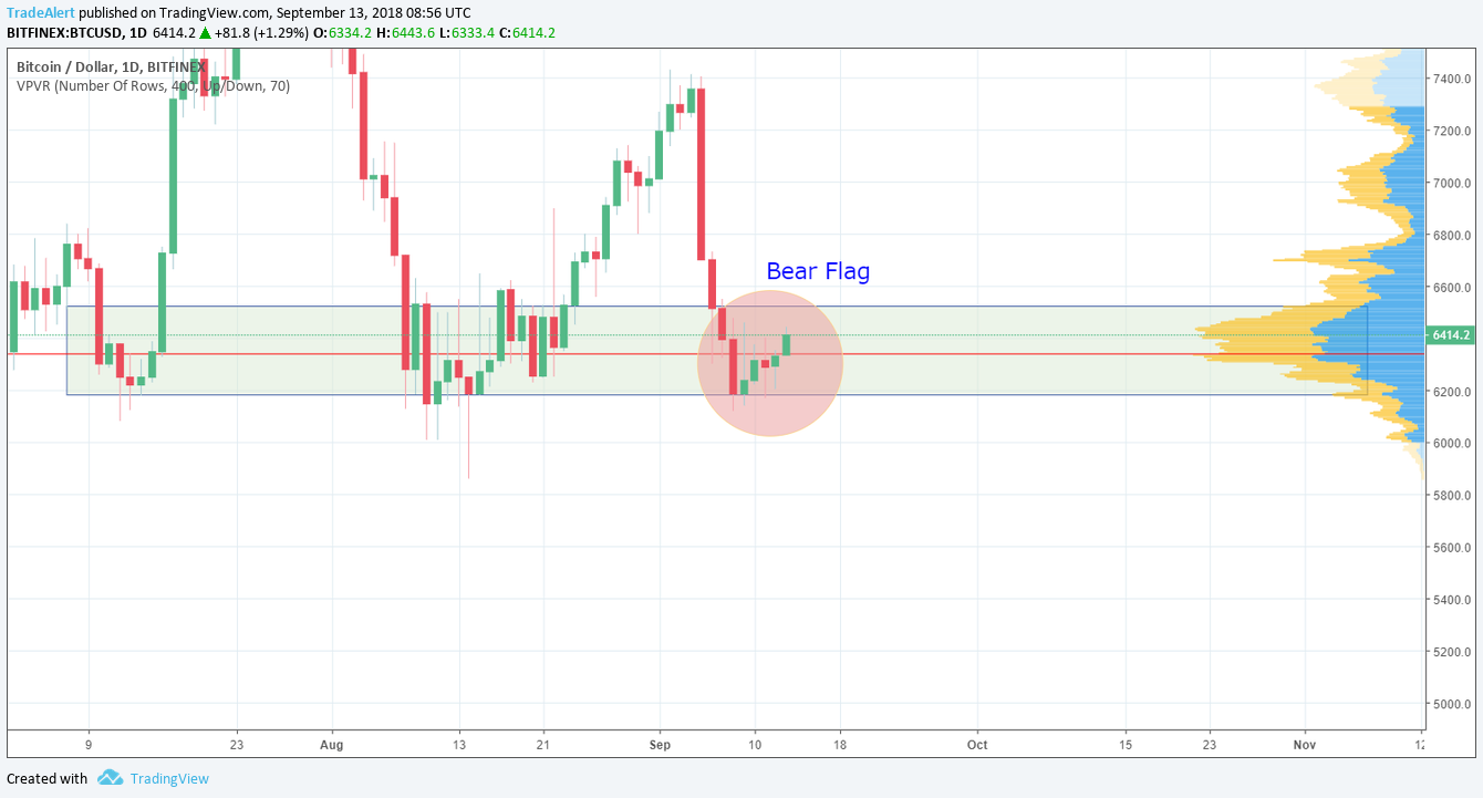 The bear flag's volume profile shows that there is not a lot of volume above $6500 which means that only a short squeeze or some fundamentally bullish news could allow us to break out of this range.