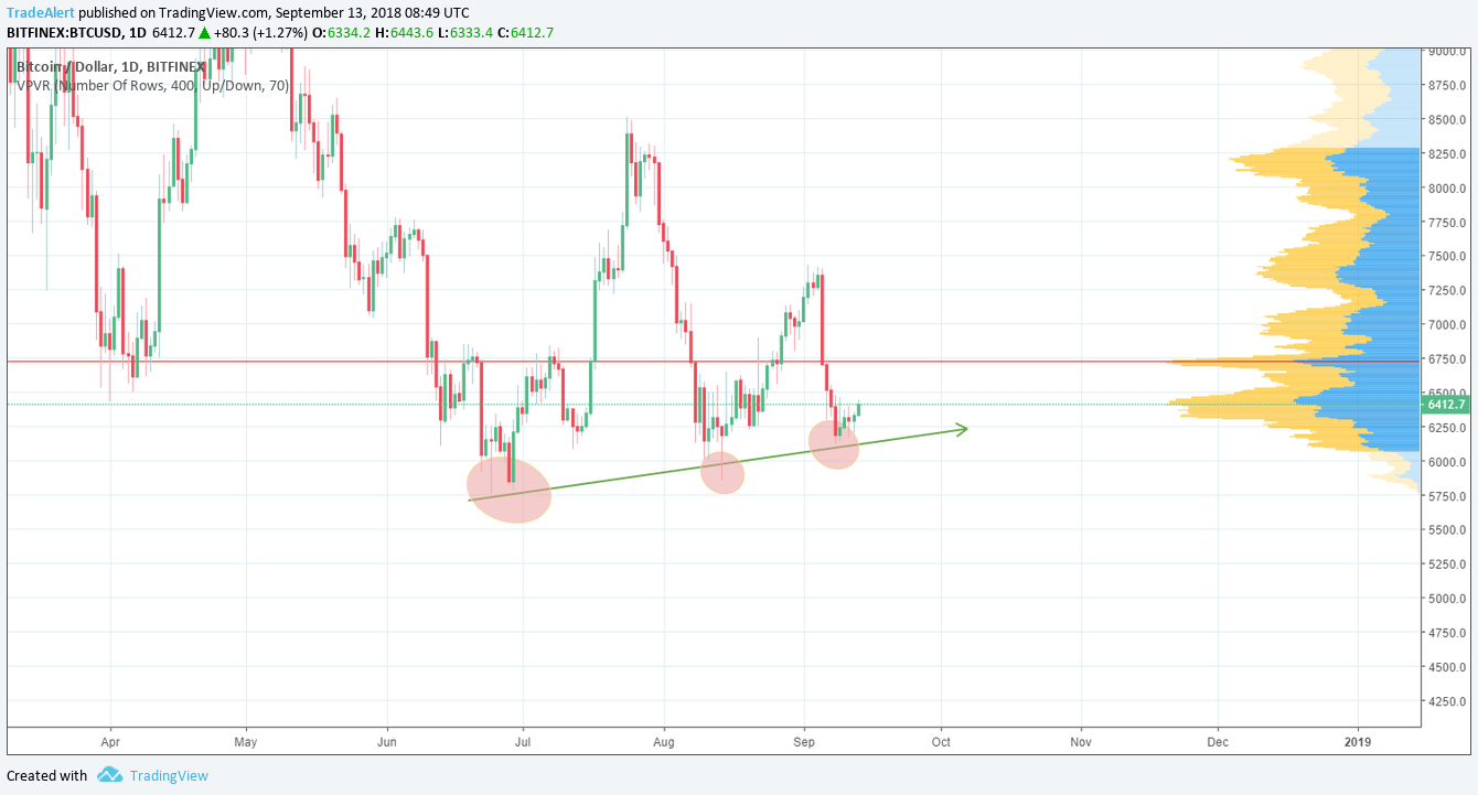 However the price has been making higher lows ever since hitting $5755 (Bitfinex USD/BTC) on June 24th, first to $5876 on August 14th (Bitfinex USD/BTC) then on September 8th at $6119 (Bitfinex USD/BTC).