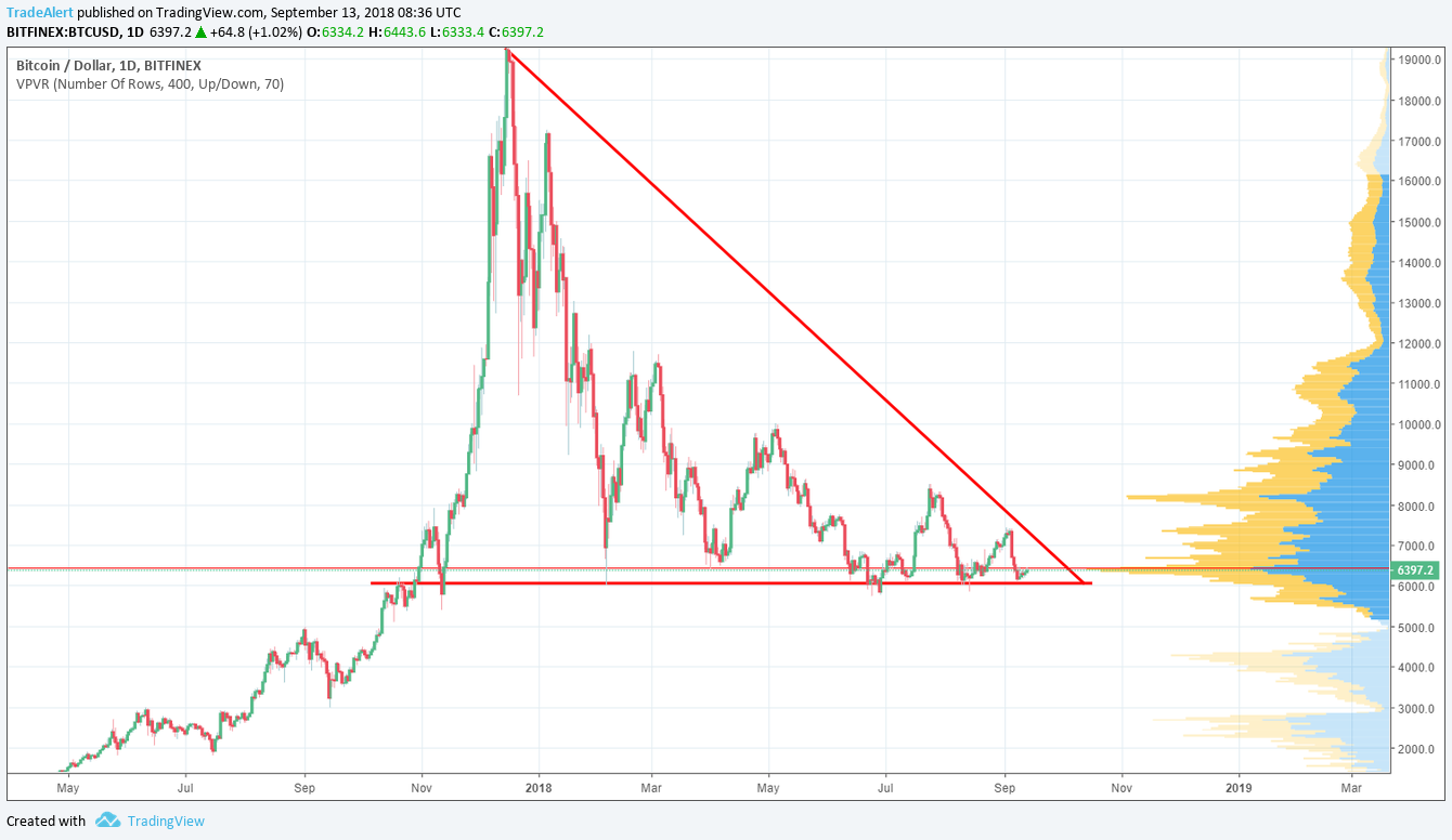 Despite the bearish descending triangle, I doubt we'll go lower than $6000 which has proved to be a solid floor on 5 different occasions.