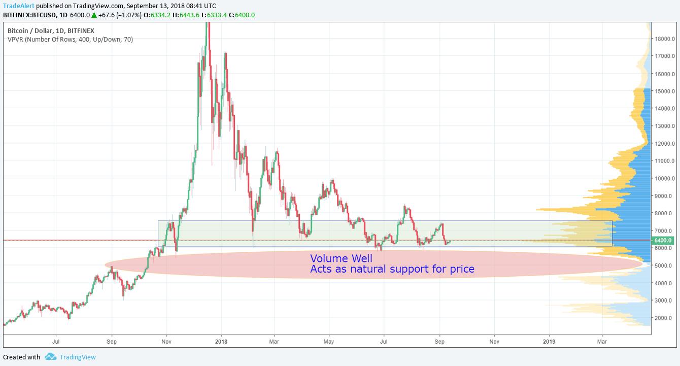 There simply doesn't seem to be enough selling pressure to take us under that huge volume well and the price has shown some slight bullish momentum since bottoming at $5755.