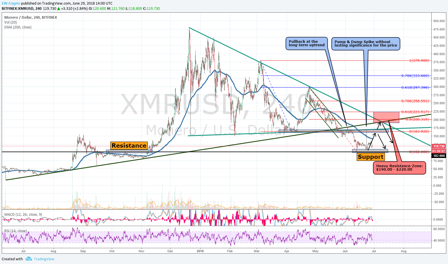 Monero (XMR / USD) is a very good example of how well charting can work if used correctly. No complicated mathematical formulas. Simply the power and market relationship between resistance and support or buyers and sellers. Monero, like many other crypto currencies, is currently struggling with a severe correction. Therefore, most charts look identical. The clock is of course the bitcoin.
