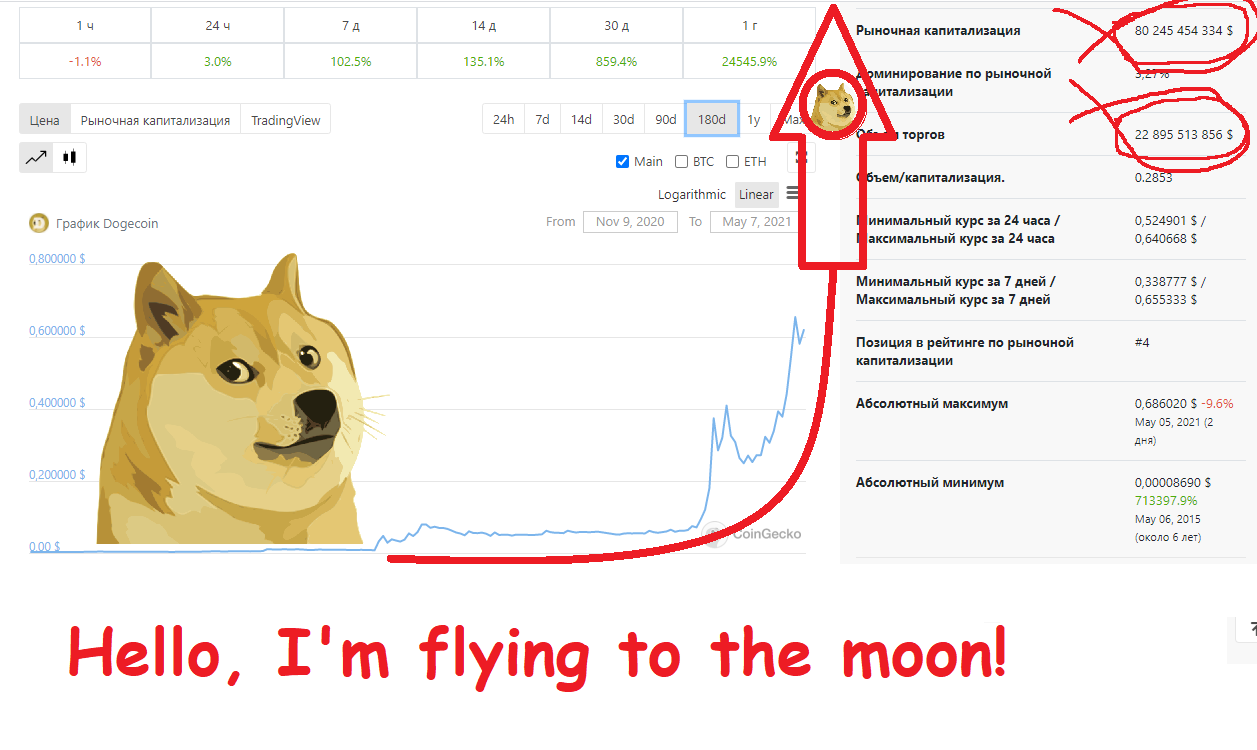 Hello, I'm flying to the moon!volondyas (29)in #cryptocurrency • 5 years ago It seems that DOGE started its new breakthrough to the moon! Dogecoin is in 4th place in terms of capitalization in the cryptocurrency market! #crypto #exchange #dogecoin