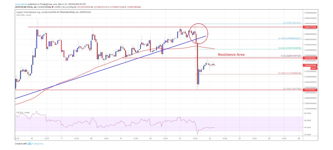 Looking at the total cryptocurrency market cap hourly chart, there was another rejection near the $136.0B resistance level. As a result, there was a sharp drop below the $135.0B level and a connecting bullish trend line on the same chart. The market cap even settled below the $133.5B support and the 100 hourly simple moving average. It tested the $130.0B support and later bounced back above $132.0B. However, there are many hurdles for more gains near the $132.8B and $133.50B levels. Therefore, upsides are likely to remain capped in bitcoin, ETH, tron, litecoin, EOS, ripple, cardano, XLM, ICX, BCH, XMR and other altcoins in the near term.