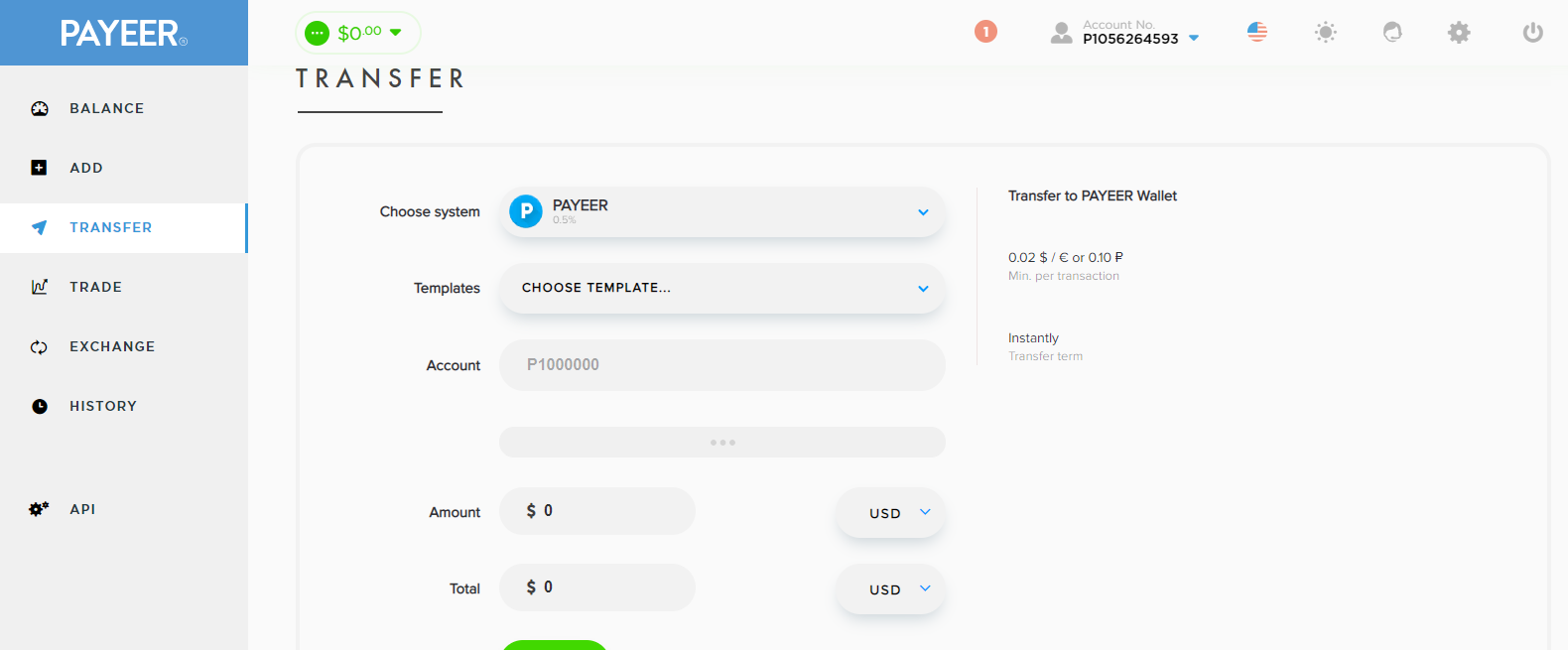 To transfer funds, also on the left, select "Transfer", select which payment system you will transfer to, account number and amount of money.