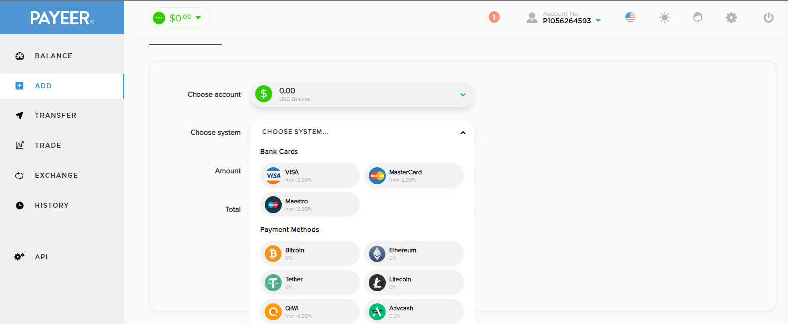 You can fund any of your Payeer accounts in many different ways. To do this, on the left, click on "ADD", select in which currency, how much and through which payment system you will replenish.