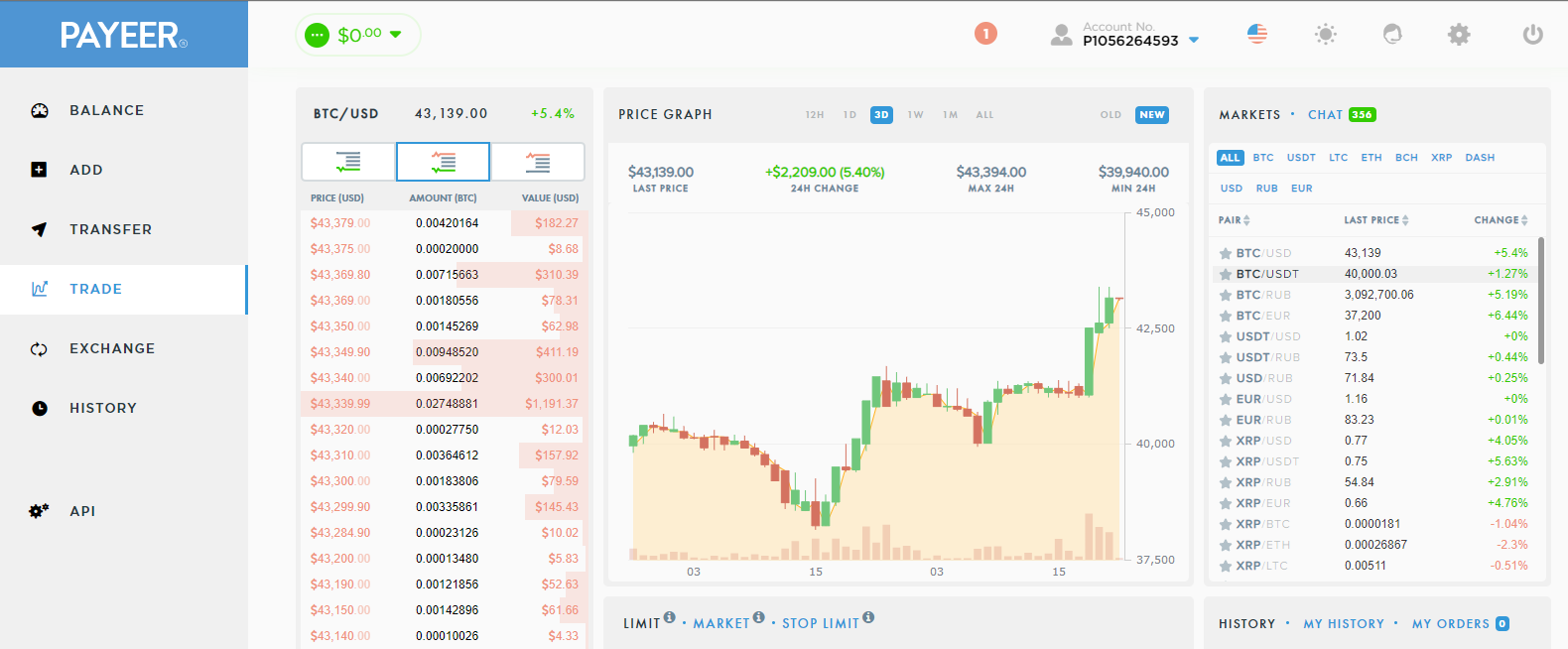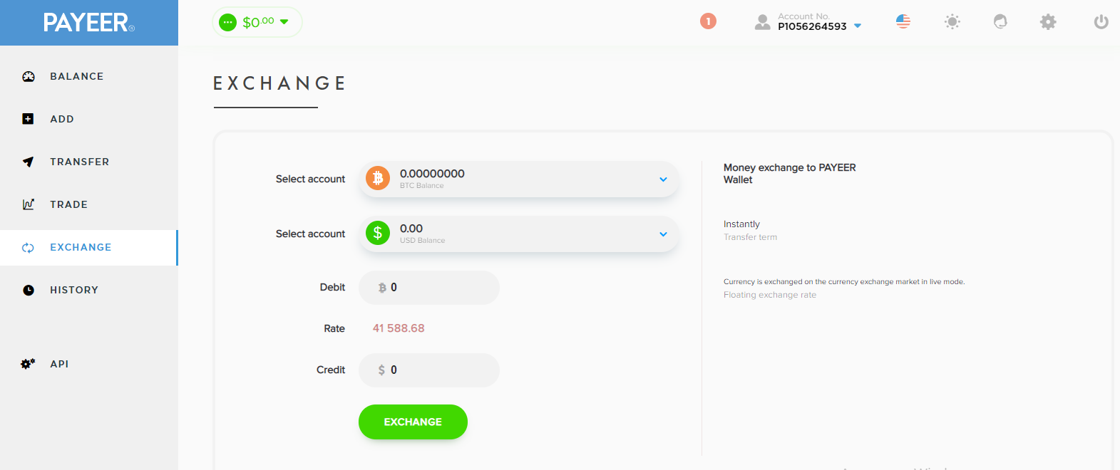 Payeer also has instant money exchange. You can not only exchange, for example RUB for USD or USD for EUR, but also exchange one cryptocurrency for another or for rubles, dollars or euros.