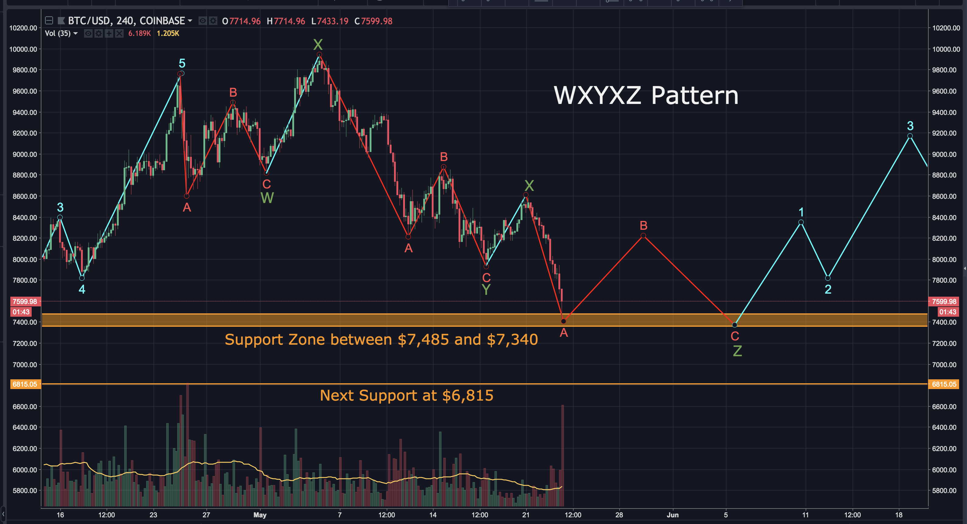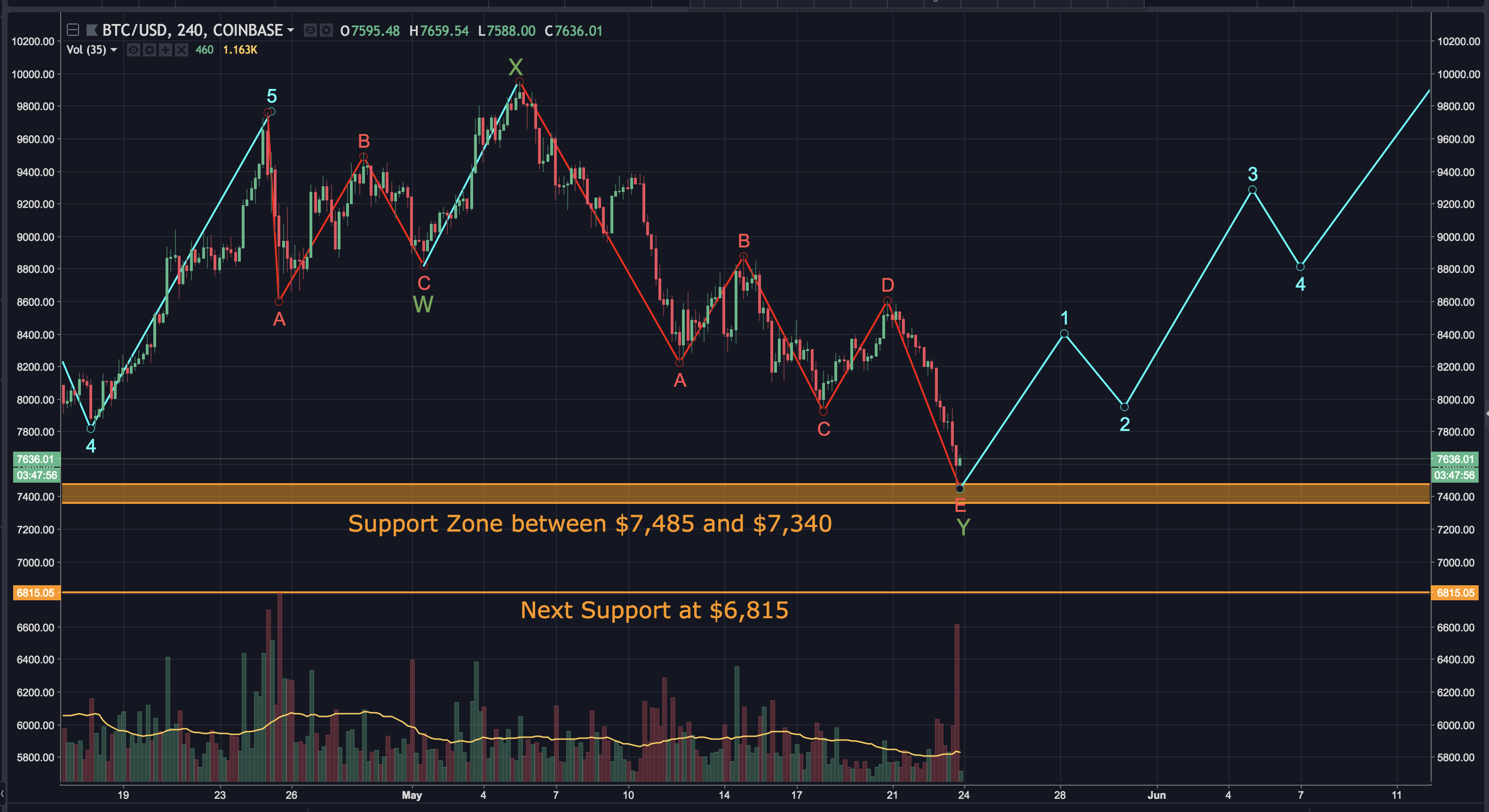 The third and final scenario is bullish. It has bitcoin completing it's WXY pattern with an ABCDE correction. In this case, Bitcoin would currently be completing wave E. There's a descent level of support between $7,485 and $7,340. If this count is correct, I'd expect wave E to bounce somewhere in that support zone and start an impulse wave up. This is NOT my primary count, but it is a possibility. Here's how it may play out: