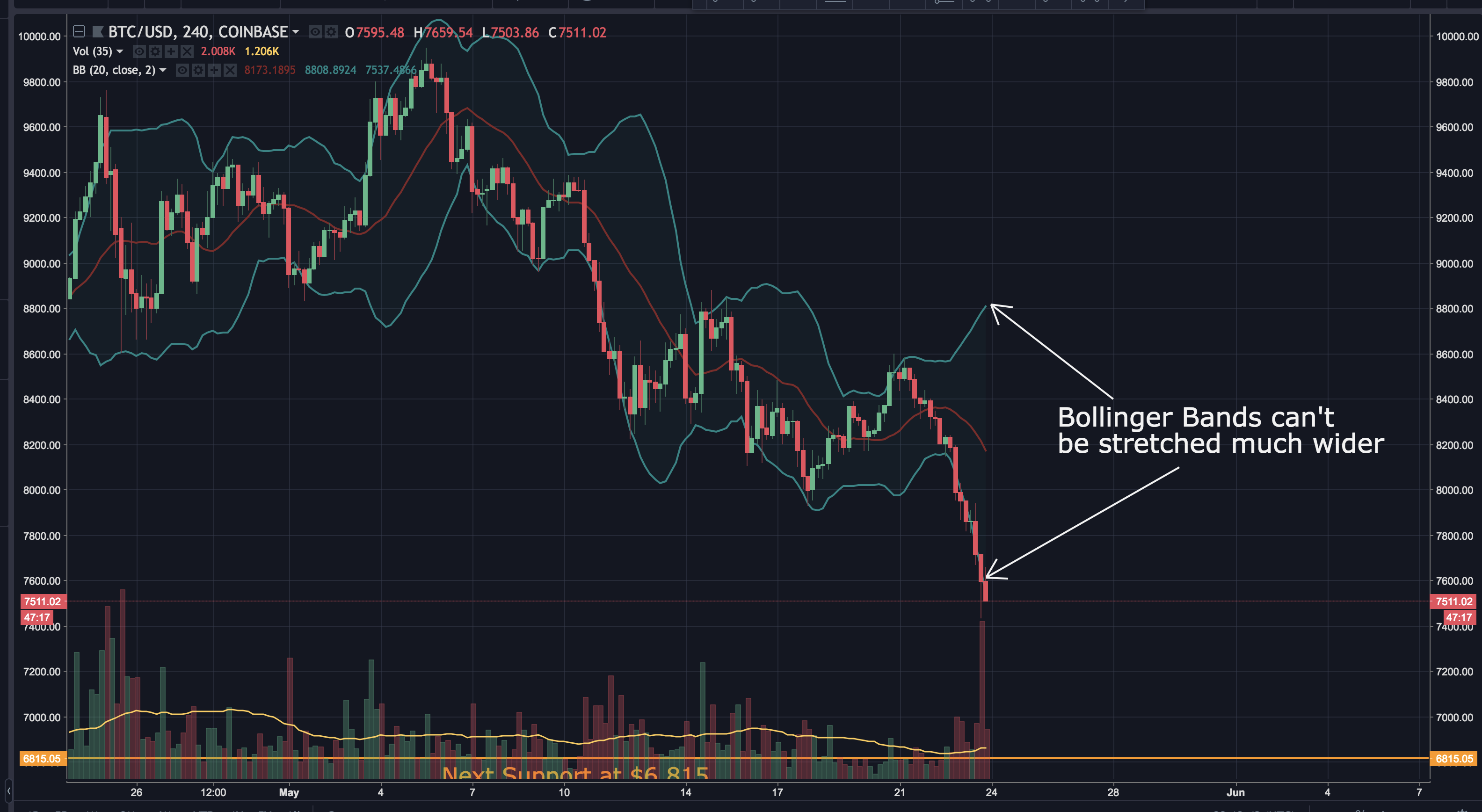 Finally, looking at the 4 hour chart, we can see the bollinger bands are stretched extremely tight. If you're unfamiliar, bollinger bands are volatility bands placed above and below a moving average. The bands automatically widen when volatility increases and narrow when volatility decreases. They typically give you an idea where the support and resistance zones are located. Like a rubber band, they usually can only be stretched so far before the price gets pushed back towards the center. Either the price is going to rise, or the bollinger bands will readjust. Depending on which one happens, it may be telling for the overall trend. If the price gets pushed back up, the market may be bottoming out. If the bands readjust, we may be in for another drop.