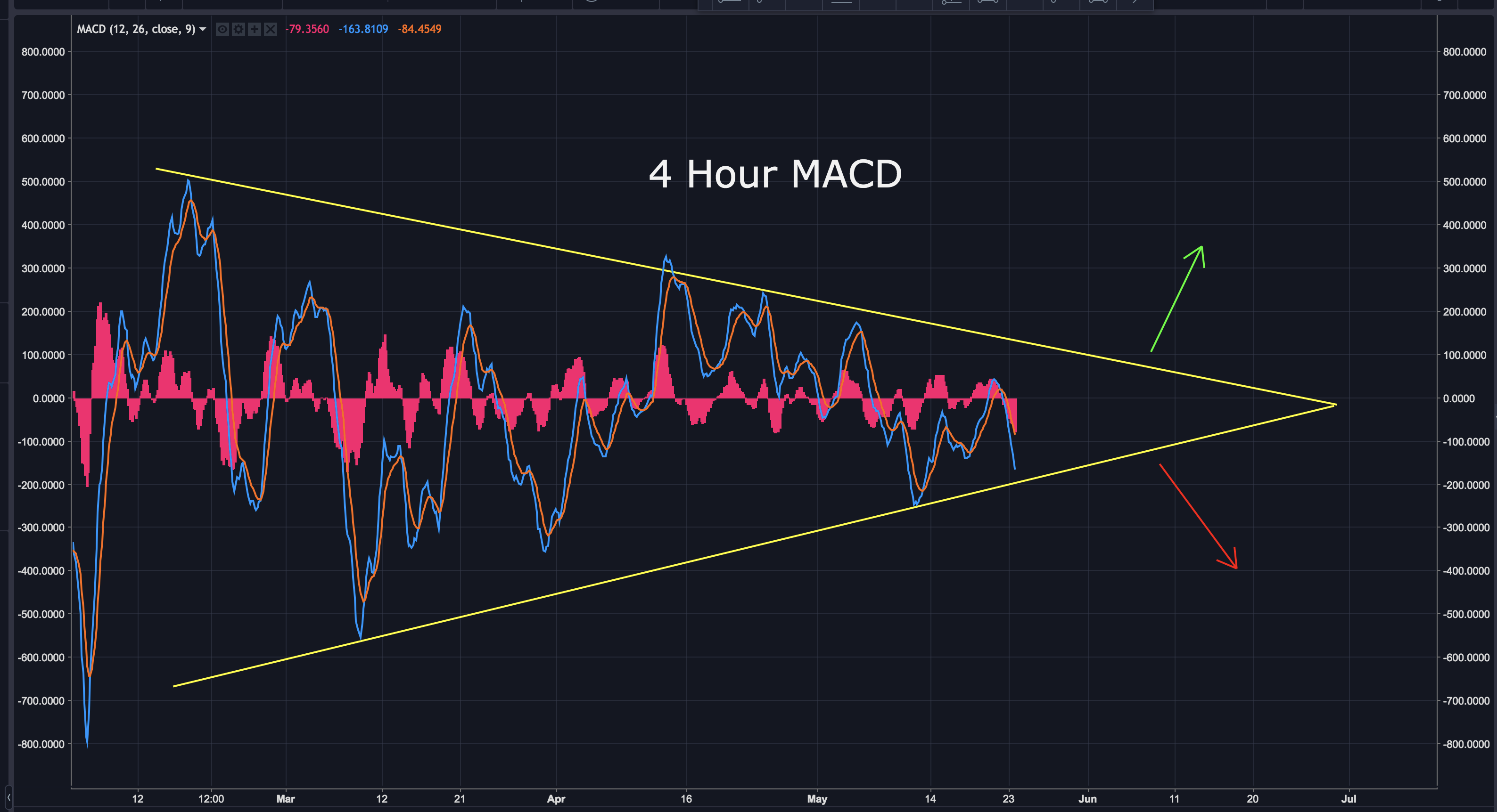 The 4 hour MACD is remaining within the wedge we've been watching. Remember as it gets closer to the apex, a major breakout up OR down becomes likely.