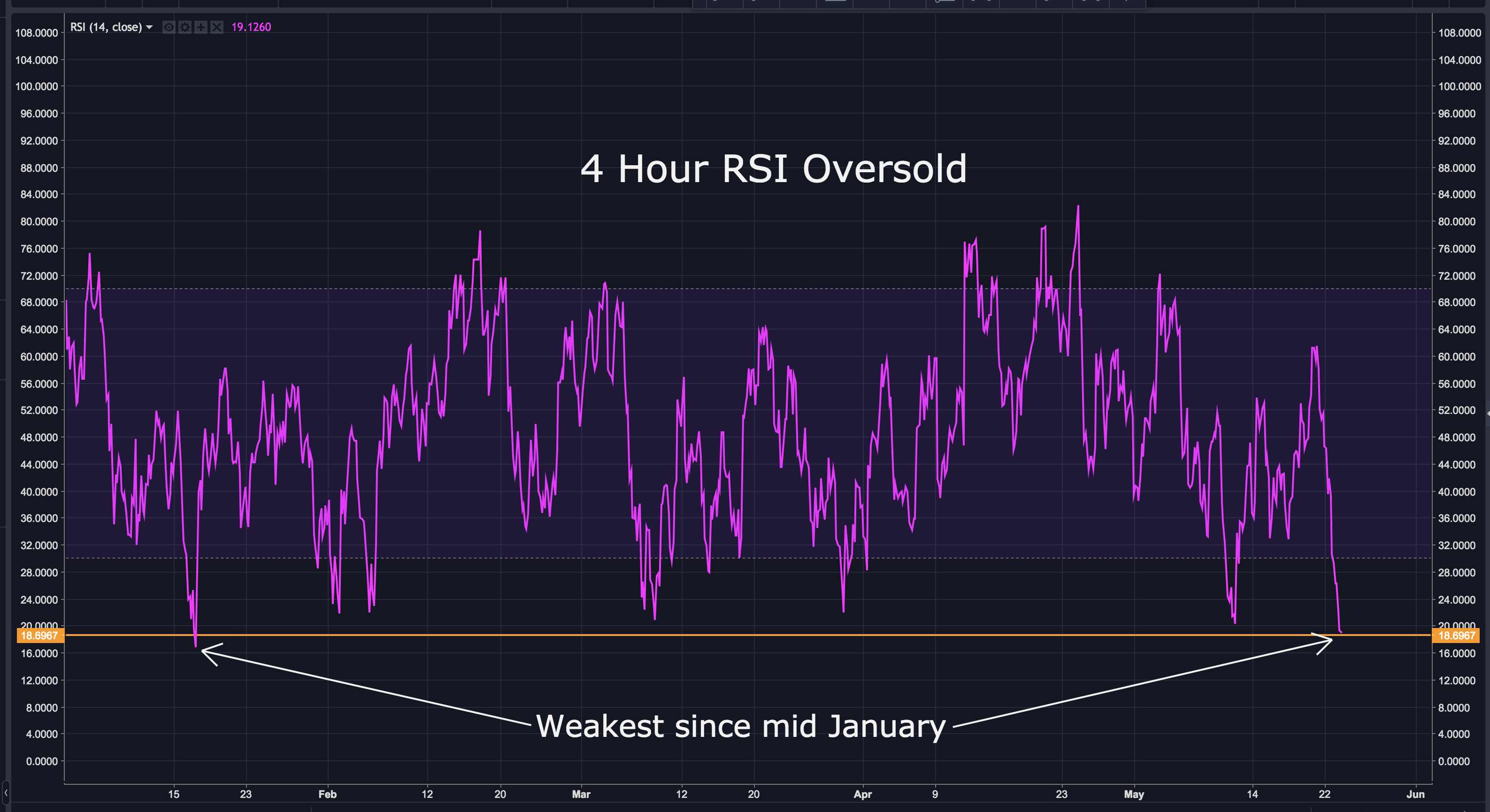 Looking at the 4 hour RSI, it's very oversold. It hasn't looked this weak since mid January.