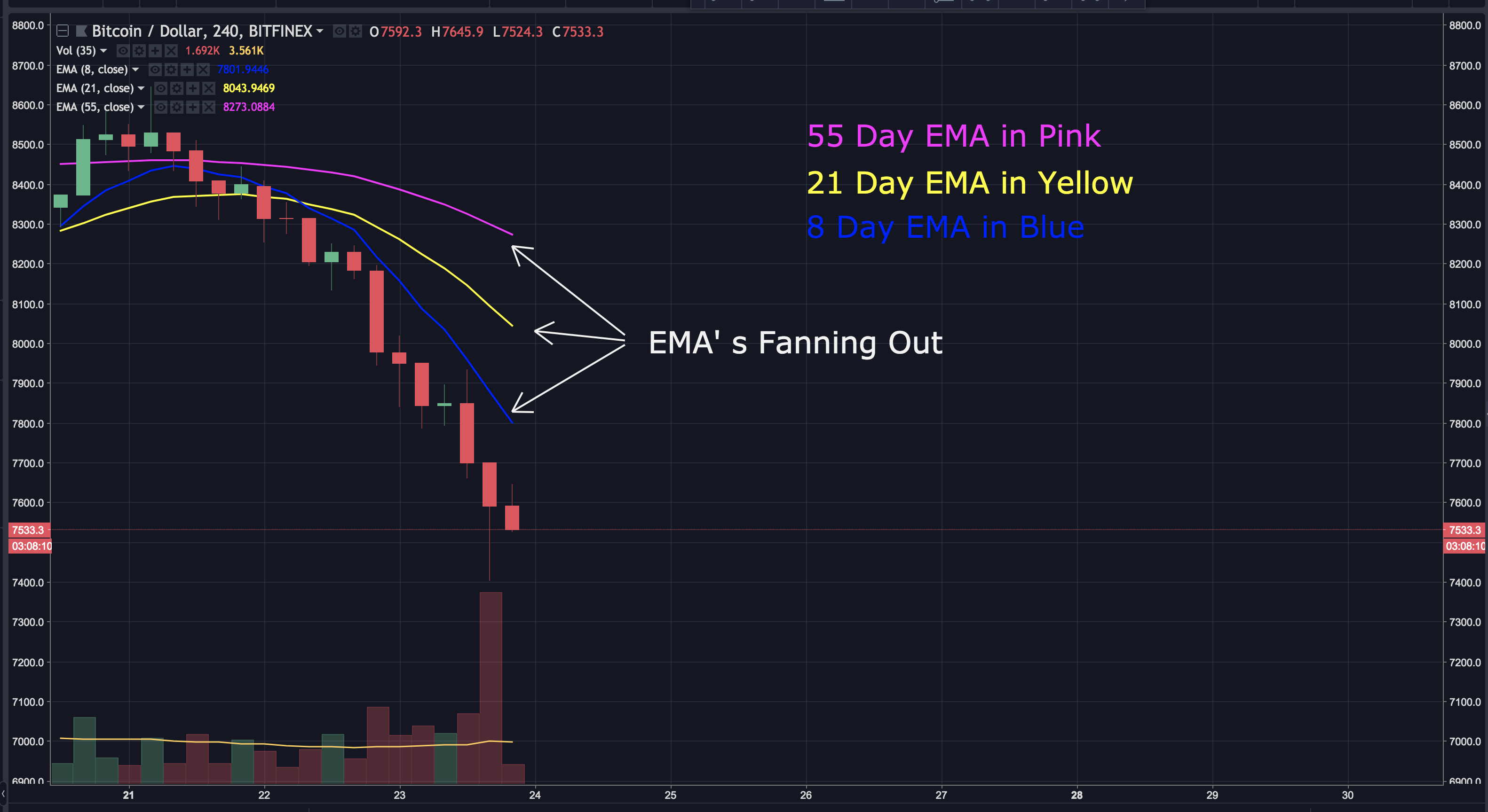 The 8, 21 and 55 day EMA's are remaining in the bearish order we've discussed (8 bottom, 21 mid, 55 top). They're also fanning out, which denotes weakness in the market. We can also see the price has dropped way below the 8 day EMA.