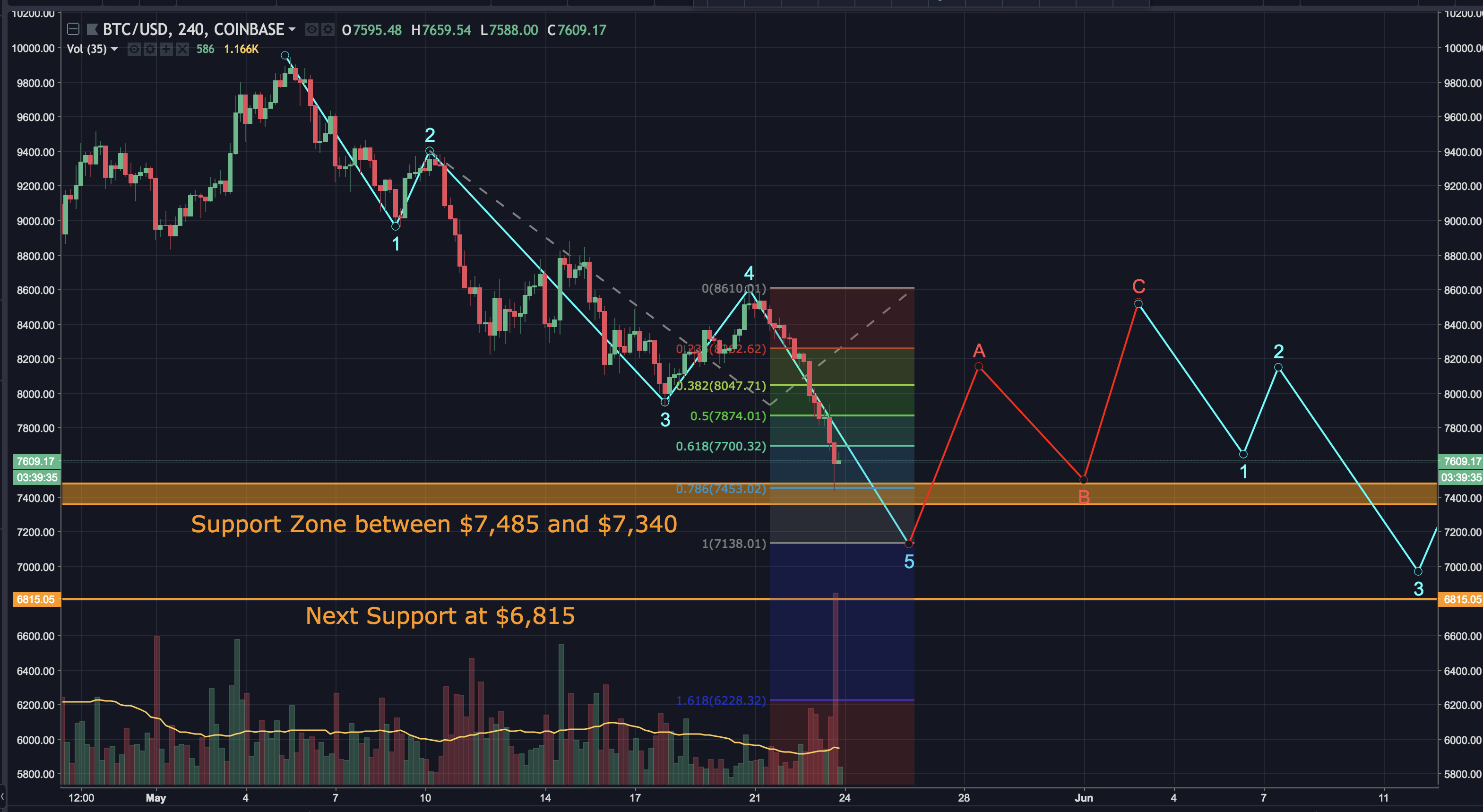 The second count is bearish. It has bitcoin completing 5 waves down. The target for wave 5 would be approximately $7,135. If this count is correct, it may play out like this: