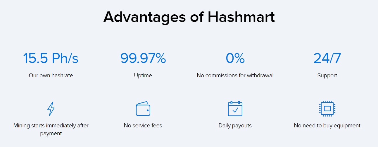 Having 15.5 Ph / s of mining power, over 1,000 Busy miners, 99.97% busy time, and 24/7 customer service as it was established a couple of decades back, Hashmart provides a number of other advantages designed only to profit for you. From no service charges, no withdrawal charges and limitations, to daily payments and real time demo balances, Hashmart has assisted you.