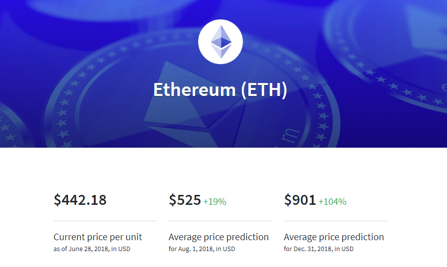 Ethereum's price was $ 442.18 on 28 June 2018. Our panelists predict it will reach between $ 360 and $ 750 by August 1, 2018. By the end of the year, Ethereum's price is projected to rise by 104%, with all , but one of our panelists predicts a positive increase from the current price.