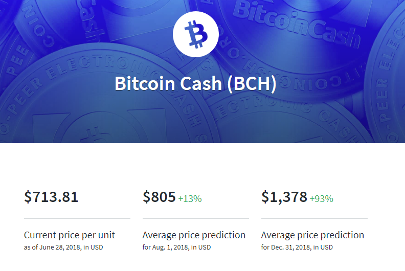 Bitcoin Cash's price was $ 713.81 on June 28, 2018. By August 1, 2018, its unit price is expected to range from $ 500 to $ 1,200, according to our panelists.