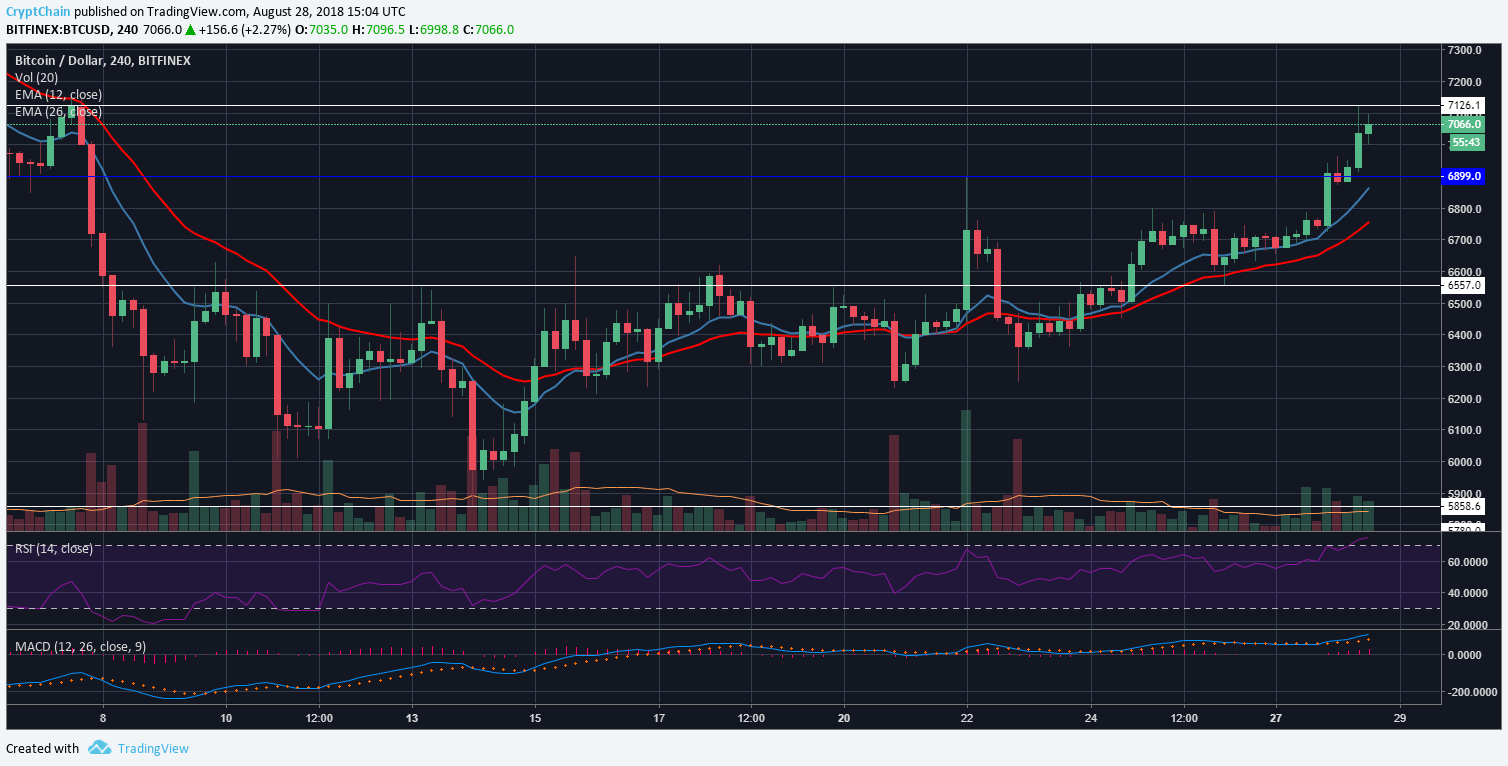 Nous disions hier que la cassure sur le H4 était imminente. Elle a eu lieu et a été bullish. Comme attendu, en cas de cassure bullish, les bulls sont parvenus à faire passer BTC au-dessus de la « résistance Bitmex » à $7,900 (ligne bleue). Il aura fallu une consolidation puis une seconde poussée pour dépasser la résistance psychologique à $7,000 et atteindre $7.126.