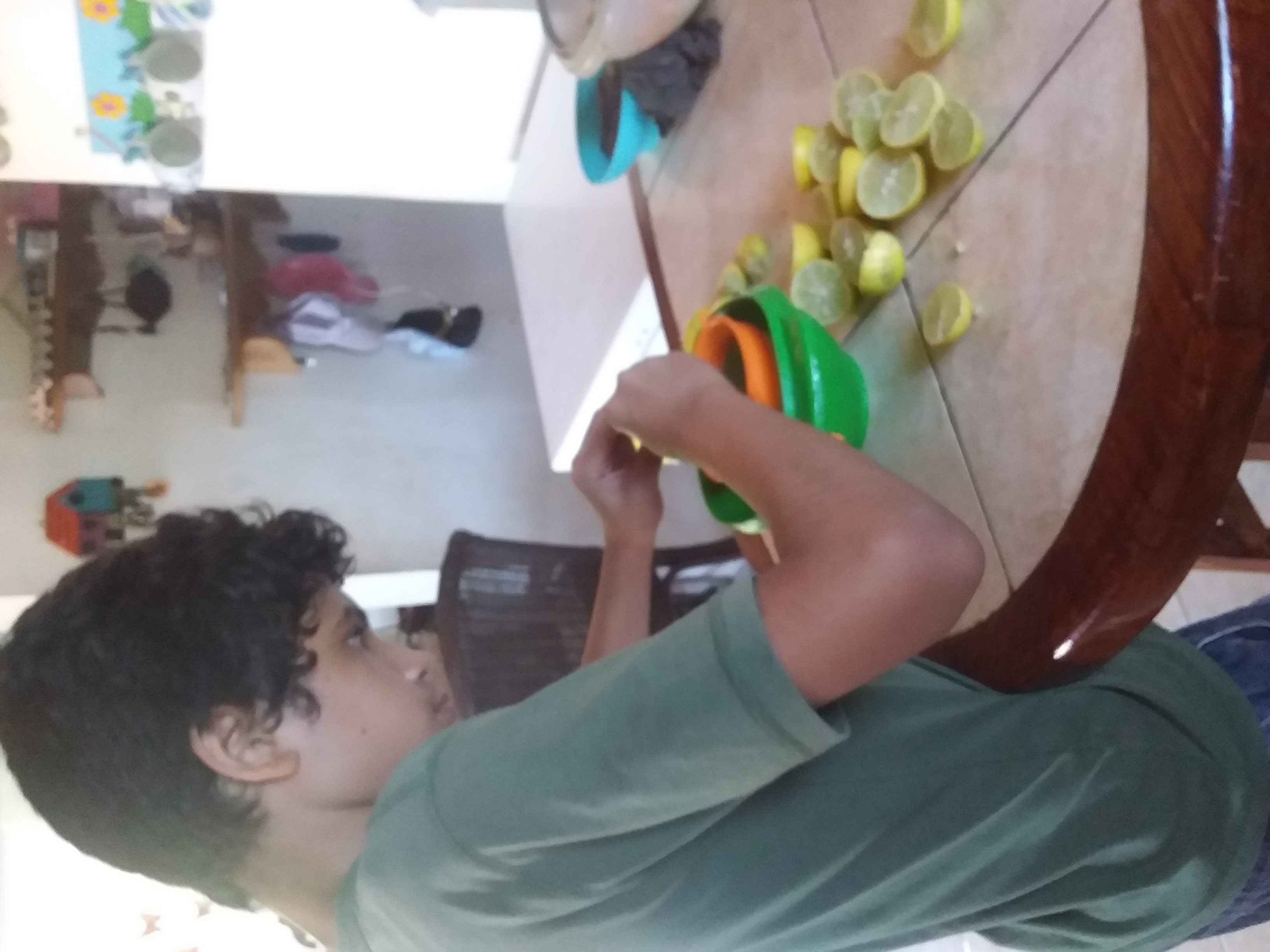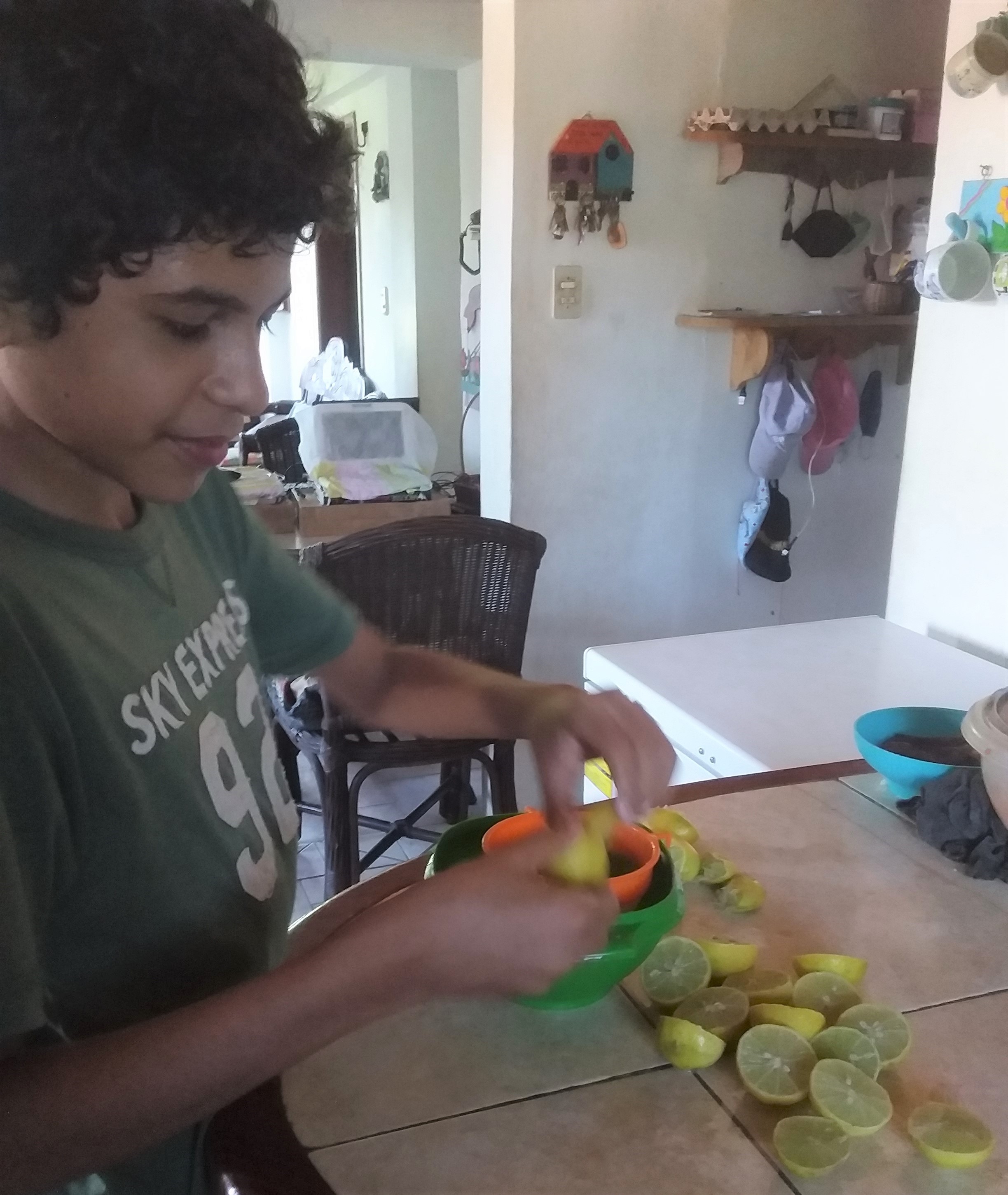 Lavé esos limones.eran 15 y los corté ,busqué el colador y los exprimí ,luego lave el colador lo puse en su sitio,reservé el jugo.
