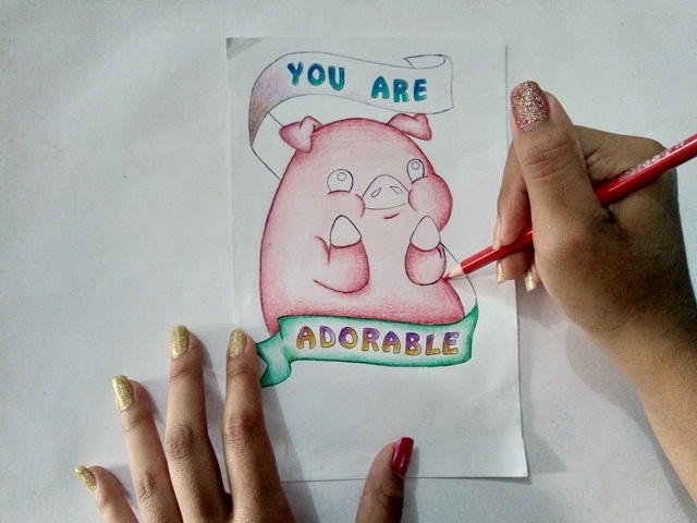 Paso 3. Ahora regresamos con Pato... Decidí darle algo de vida al rosa y utilice un color rojizo para sombrear a sus patitas, orejas y el contorno del dibujo, por supuesto no hay que olvidar colocar rubor en sus cachetes mas adelante. Seguidamente con mi dedo difumine todoo lo que había hecho anteriormente.