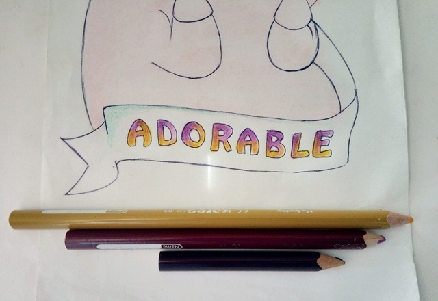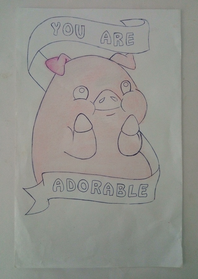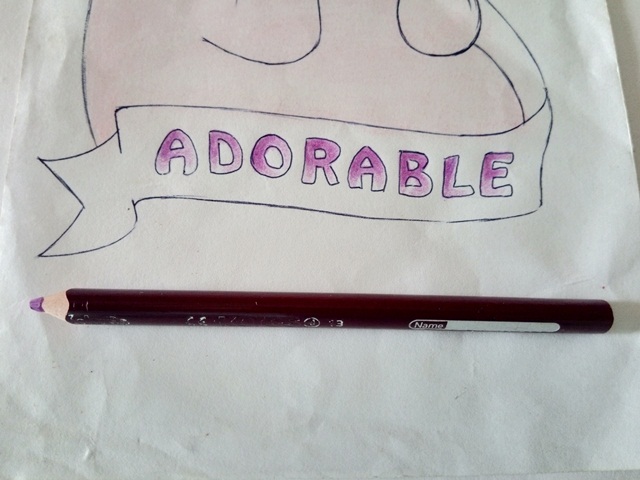 Paso 1. Primero con grafito realice el boceto del dibujo asegurándome que cada detalle quede de la manera en que quiero. Con un bolígrafo negro delineé todo el dibujo, espere que secara el boli y con cuidado de no arrugar la hoja borre todo el grafito. Después tome uno de mis creyones rosados pastel y rellene todo el dibujo, luego con un trapito de algodón difumine todo el creyón para que quedara liso, de esta manera: