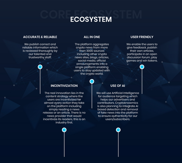 However, there is a solution to this problem, namely Cryptoknowmics. The development team is creating an all-in-one decentralized platform that covers virtually every aspect of the crypto space, turning it into a source of reliable information and services for the crypto industry. It's like a wall street magazine for the crypto world with lots of extra features. The innovation of this platform is the content strategy, in which users are given incentives for almost every single action they perform on the platform.