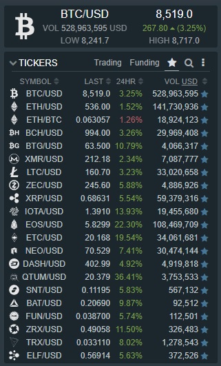 A little sideways action for BTC over the last 24 hour period and we are up just over 3% this morning at ~$8,500 (low of ~8100 and high of ~8700.) ETH is just ETHing along with a more modest uptick while Eth Classic is leading the way for a few alts. QTUM has had a nice awakening and EOS seems to be gaining some steam as it heads towards the launch in the summer so you should see good up and down on that one.