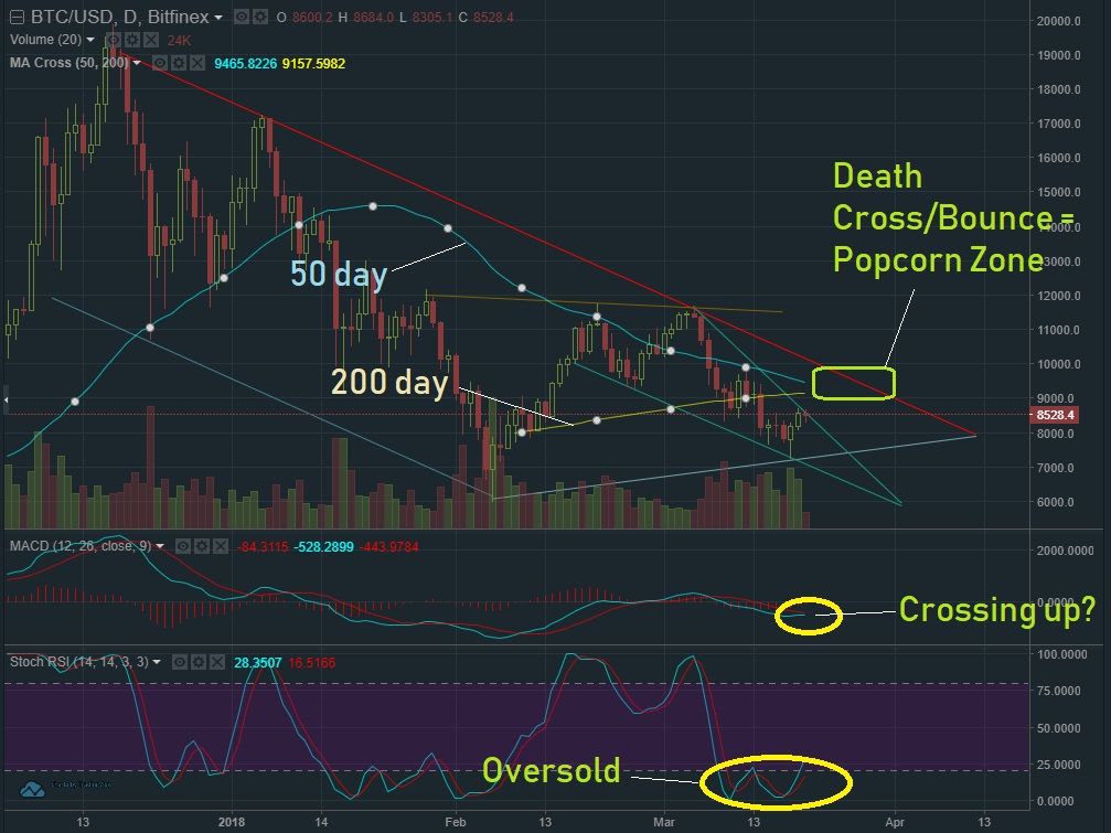 If we back out to the daily view for a look at where we may go longer term, it is a Dickens novel really (Tale of Two Cities? nyuk nyuk! Classic! https://en.wikipedia.org/wiki/A_Tale_of_Two_Cities) The RSI is fairly under-bought and undervalued with room to go up and the MACD is threatening to cross up which would be a nice pump. The cautionary tale is the looming possibility of the Death Cross (when the 50-day average crosses the 200-day average downwards) which would signal a larger drop (down to the tip of the Wedge?) Adversely, if the volume and the sentiment continues, the 50 could bounce off of the 200 and we would be headed to crypto spring in a nice fashion. So, be patient and NO FOMO!