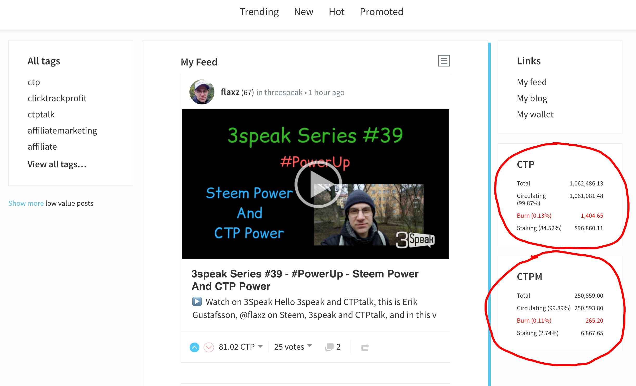 You now can see exactly what's going on with the CTP and CTPM tokens with this slick new addition to your condenser. As you can see, we have a pretty big 'staked' percentage and low circulation on the token.