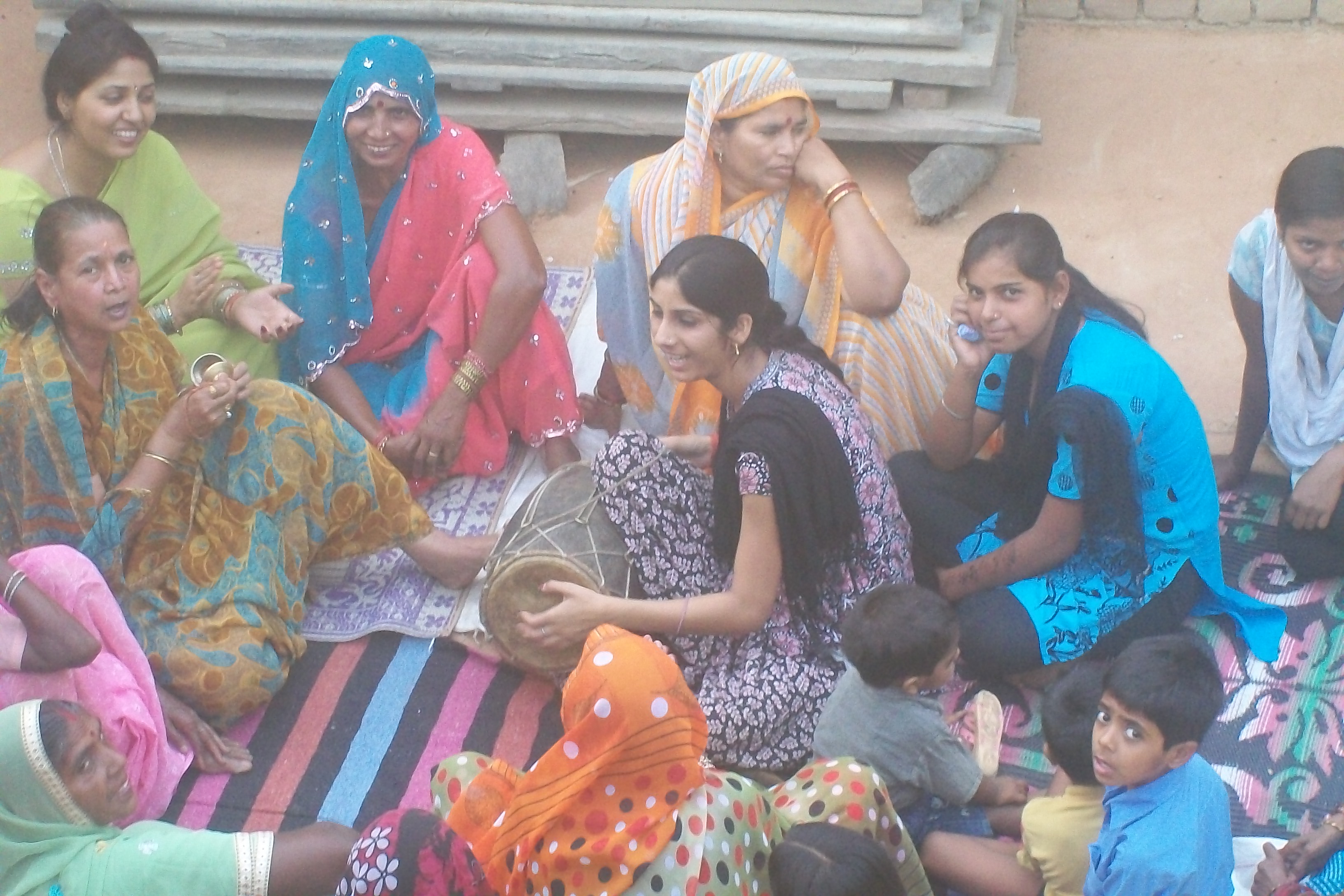 In this picture, village-women are celebrating an auspicious occasion by offering songs to their Gods. The younger girl is playing an Indian percussion instrument called "Dholak" and the older woman is playing another percussion instrument called "Manjeera" (a pair of clash-cymbals which make high-pitched percussion sounds). They are singing about the glory of all the Gods and Goddesses to seek their blessings.