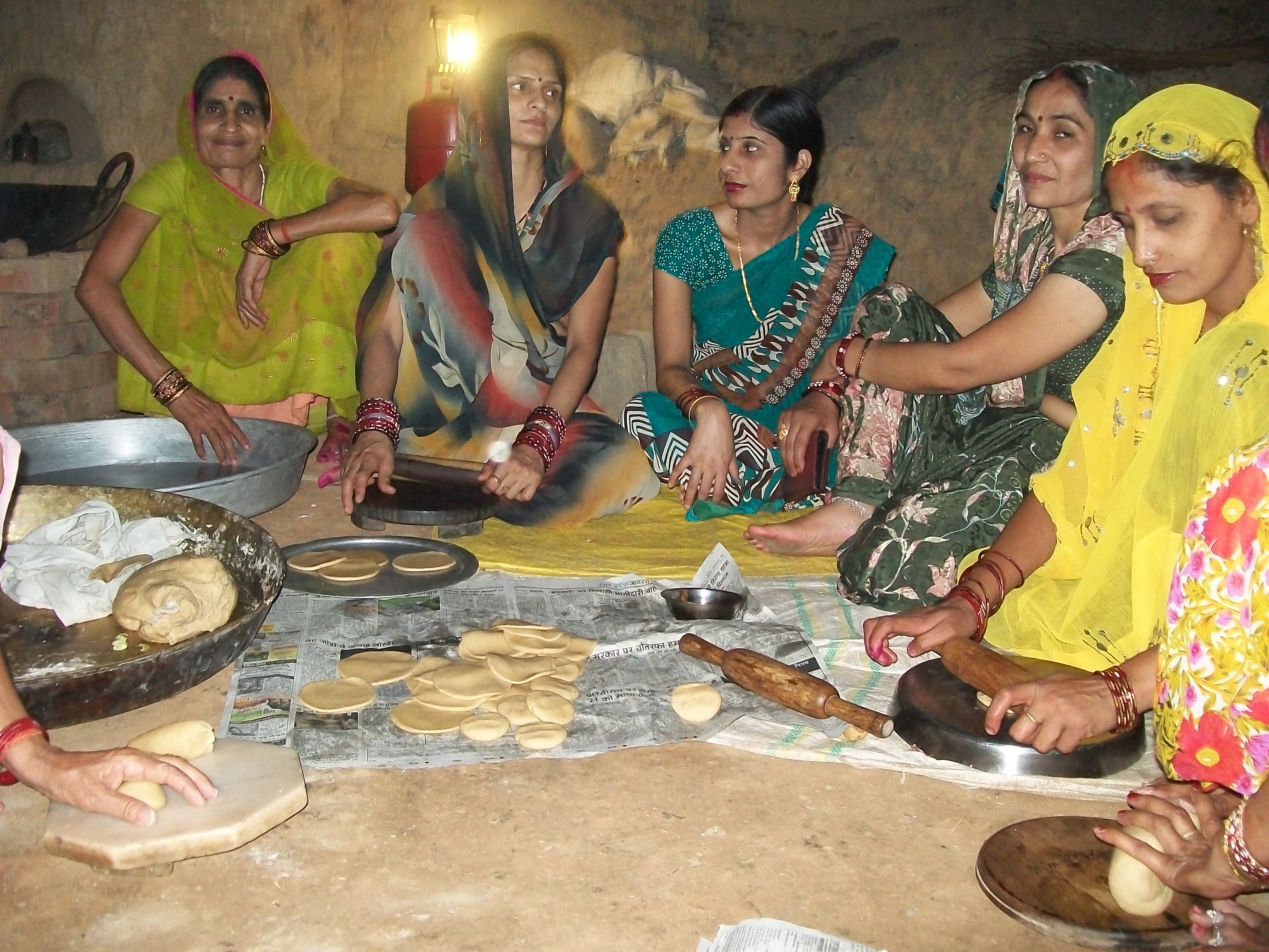 In the first picture, two women are deep frying pooris (deep fried bread) and kachauris (stuffed and deep fried bread). While in the second picture, four women are seen rolling out the dough into circular shapes. Few other females are sitting there to give company and also to switch places whenever required. It is evident through these two pictures that food is being cooked in good proportions and all the women from the house and neighbourhood are working in apt synchronisation for smooth functioning. Whereas in the third picture a man from the neighbourhood is seen cooking the potato curry. Usually the men of the family are assigned other tasks of organising the event but in this case, he had to prepare a ceremonial curry to be presented to the Gods much before the meals.