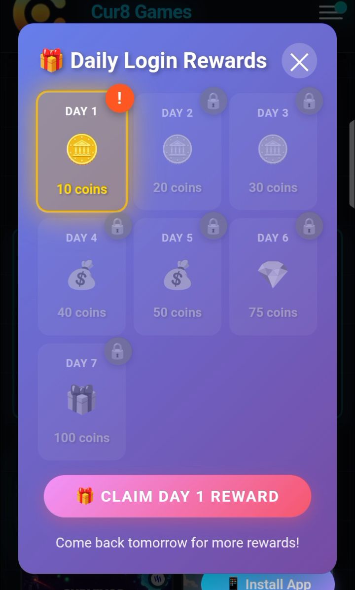 I have began my weekly agenda, playing Cur8 Games for this week's tournament, April 20 to April 26. The very first thing I did was to claim my Day 1 daily login reward which gave me 10 coins.
