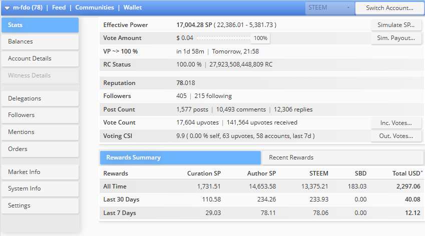 | Current voting CSI: | 4.1 ( 9.80 % self, 100 upvotes, 66 accounts, last 7d ) |