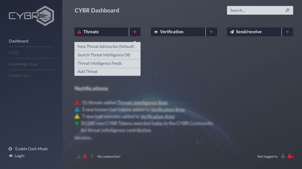 Разумеется, разработчики создали свой сайт, где собственно все подключаются к системе CYBR. У каждого пользователя есть свой личный кабинет, в котором содержится вся информация о возможных угрозах, а также транслируются все новости криптомира. Для решения вопросов есть своя служба поддержки, а также раздел с часто задаваемыми вопросами.