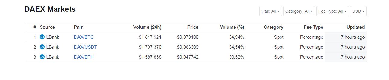 Если говорить о бирже, то скажу, что до этого я был с ней не очень знаком. Когда изучил проект, пришлось и разобраться, что из себя представляет криптовалютная биржа LBank. К моему удивлению биржа оказалась весьма достойной. На ней можно комфортно заниматься торговлей и я уверен в безопасности хранения активов на ней. DAX имеет 3 торговых варианта, что очень хорошо. Не на каждой бирже, можно обменивать крипту на фиат, это еще один плюс в копилку этой биржи. Так же оборот на LBank составляет более 200миллионов долларов и DAX находиться на 20 месте прямо сейчас, что является приемлимым результатом за такое короткое время.