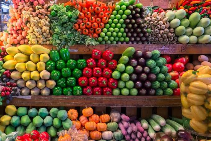 which sells vegetables on a small red plastic tray, is located in the local market.