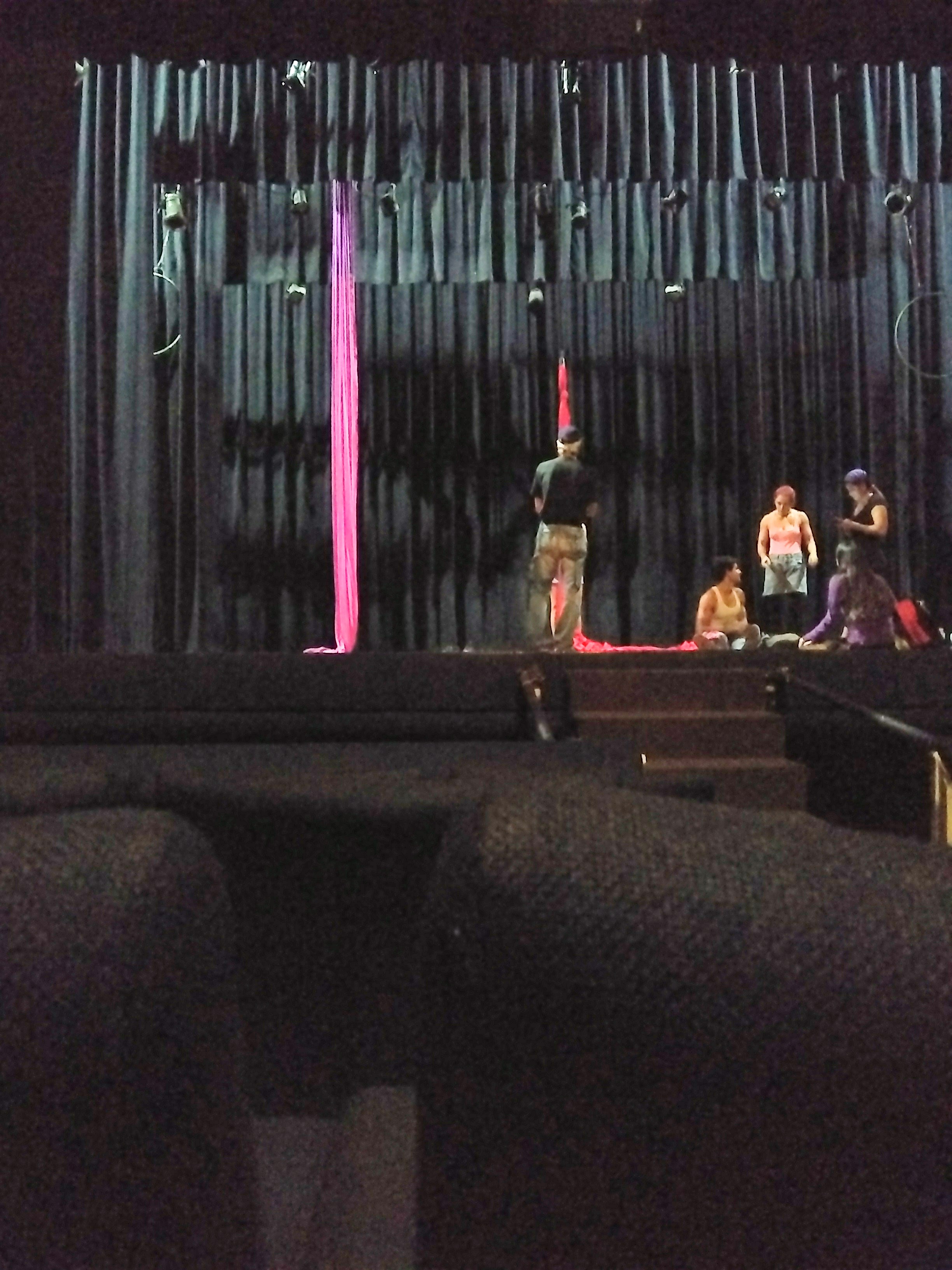 Llegada la hora había un grupo de danza contemporánea que estaba espaciando, nosotros empezamos a ver y planear cómo íbamos a distribuirnos en el espacio ya que todo había cambiado. La tela iba a estar ahora en el centro porque la compartíamos con otro grupo aéreo y además ahí podía ser utilizada con mayor libertad. Esto nos generaba un desequilibrio en el escenario por lo que decidimos en último momento, los músicos, colocarnos en una esquina para no ser tan notorio el desnivel escénico.