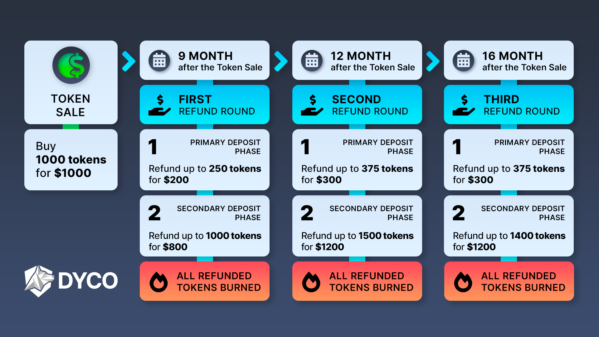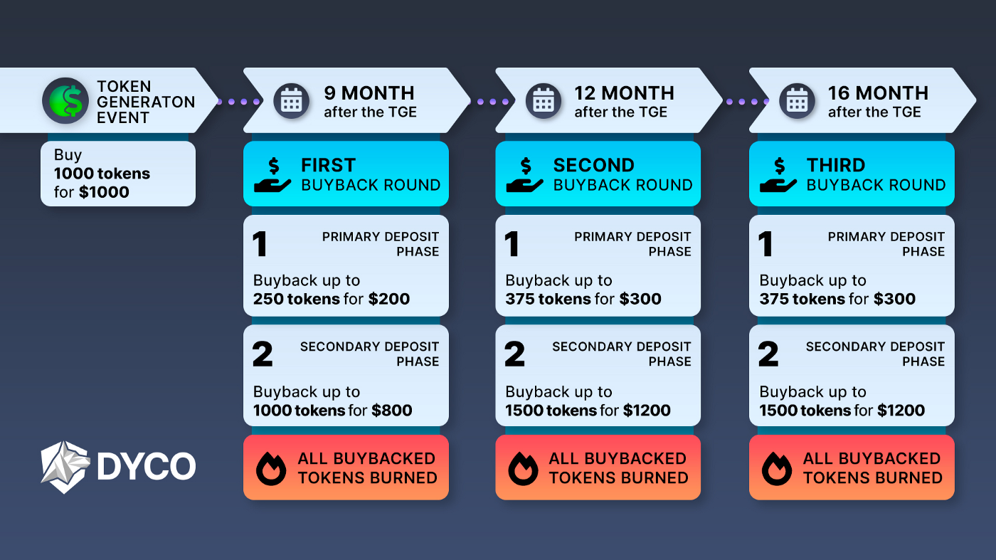 Her üç geri alım talep edildikten sonra, kişi DYCO'da satın alınan 100 dolarlık tokenlerini bir $80 geri alım için iade edecektir. Kişinin DYCO'dan aldığı tüm tokenler yakılacaktır.