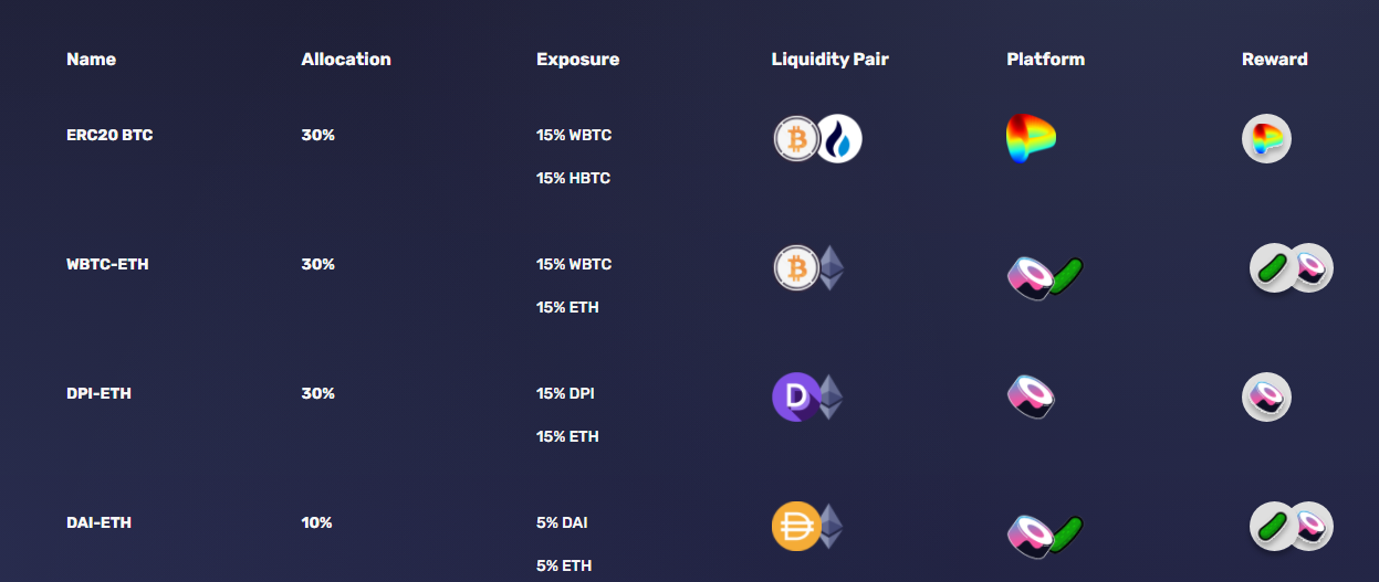 People could think this is a simple BTC or ETH buying in order to hold and get rewards base on the coin appreciation but this strategy doesn’t take long positions on cryptocurrencies. The idea is to provide WBTC and ETH liquidity for example, in the best and more profitable decentralized exchanges in DeFi sector like SUSHISWAP, CRV and PICKLE. This will generate a series of associated benefits like: