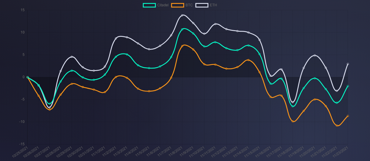 Performance of DAO CITADEL compared to BTC and ETH