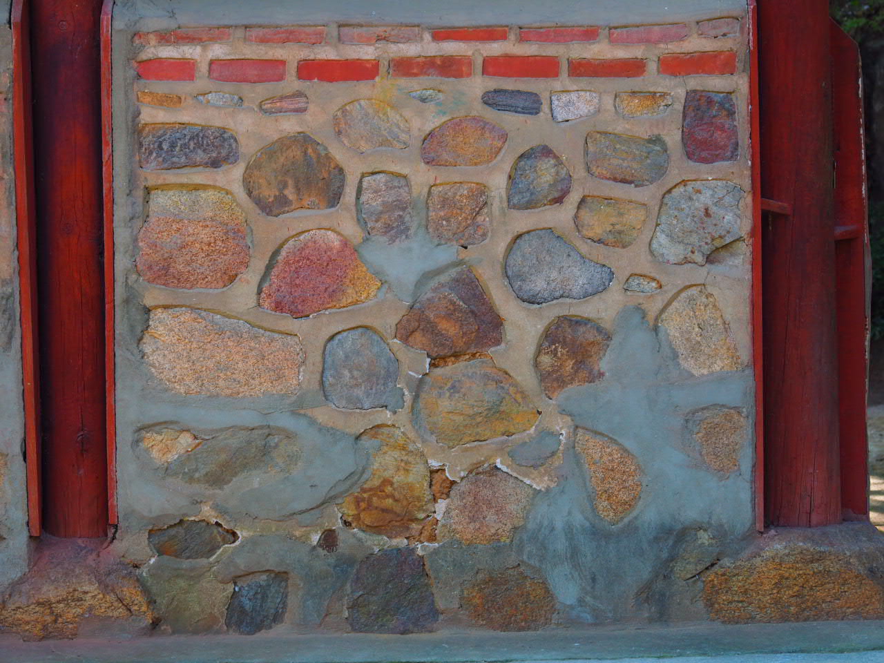 Occasionally I saw the bottom of a pillar made of stone, but it was rare case to see stones at the bottom of the wall.