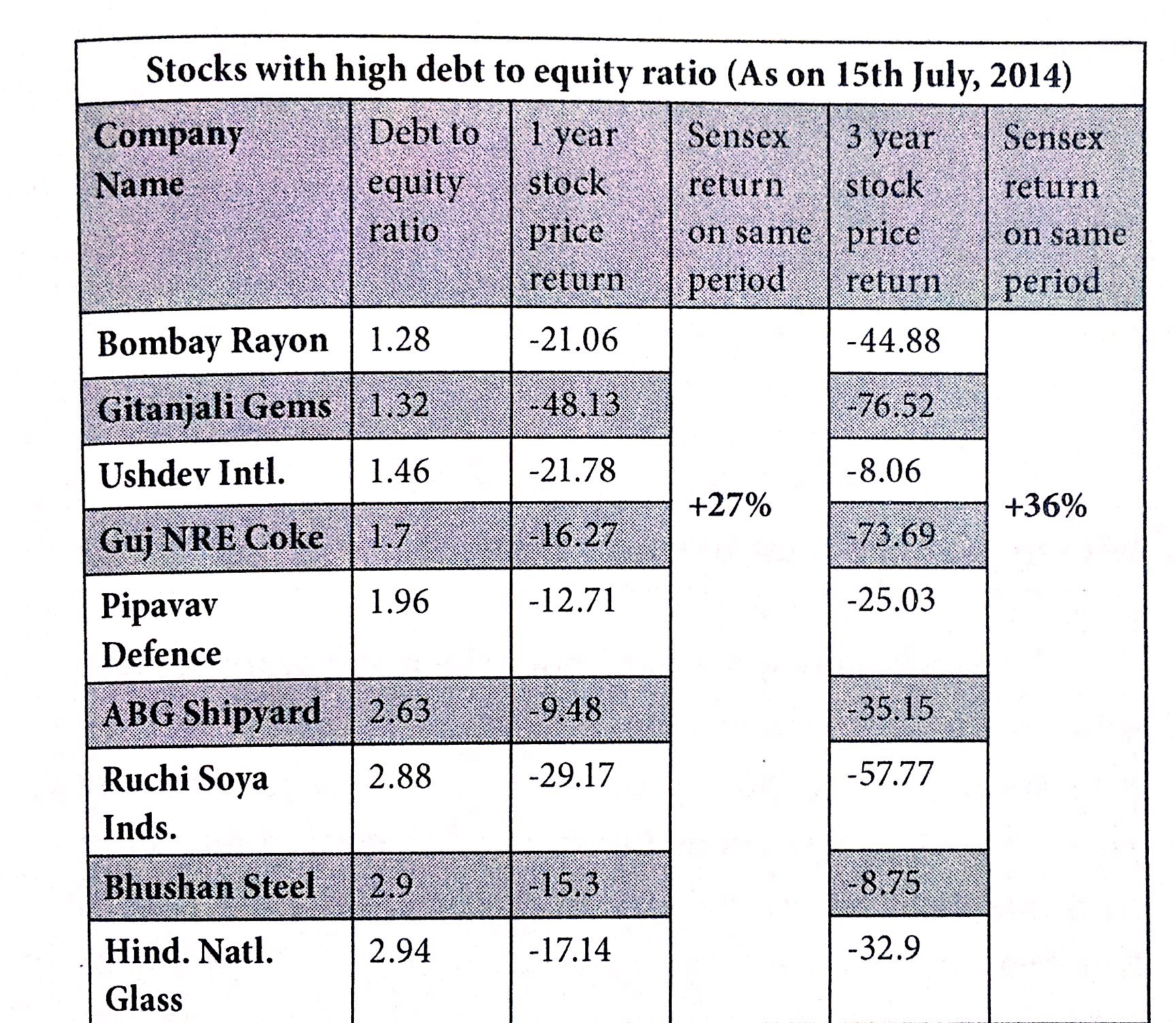 The above table displays an interesting result. All those companies had generated negative return during the last 1 year and 3 year period. Most importantly while Sensex is showing 27% and 36% return respectively. So, it doesn't matter whether the market is in bull phase or bear phase, companies having high debt level perform badly across any market situation. There are exceptions if the company can improve its debt level significantly.