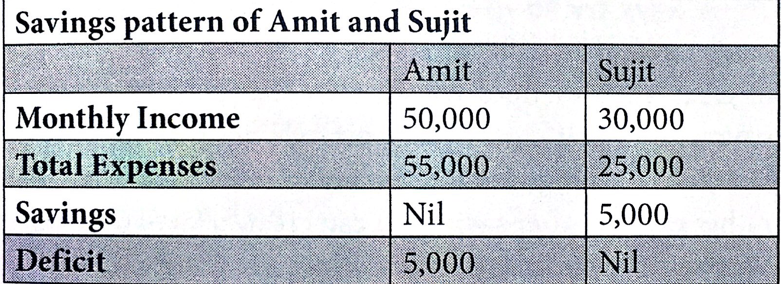 Amit and Sujit both are working in a software company. Amit draws a monthly salary of Rs- 50,000 while Sujit takes Rs- 30,000 per month. A Higher salary is perceived as better financial position, but the same can cause financial disaster! Now let's have a look at the various expenses of the both individuals. Higher salary tends to the luxurious lifestyle, bigger house, and expensive car. Amit has home loan EMI of Rs- 18,000 while the same for Sujit is Rs- 8,000. Amit owns an Audi A4 while Sujit is satisfied with his Maru Suzuki Dzire. Amit shells out Rs-12,000 EMI for his ca loan while Sujit shells out Rs-8,000. Let's have a 100 the following chart for the detailed income and espe pattern