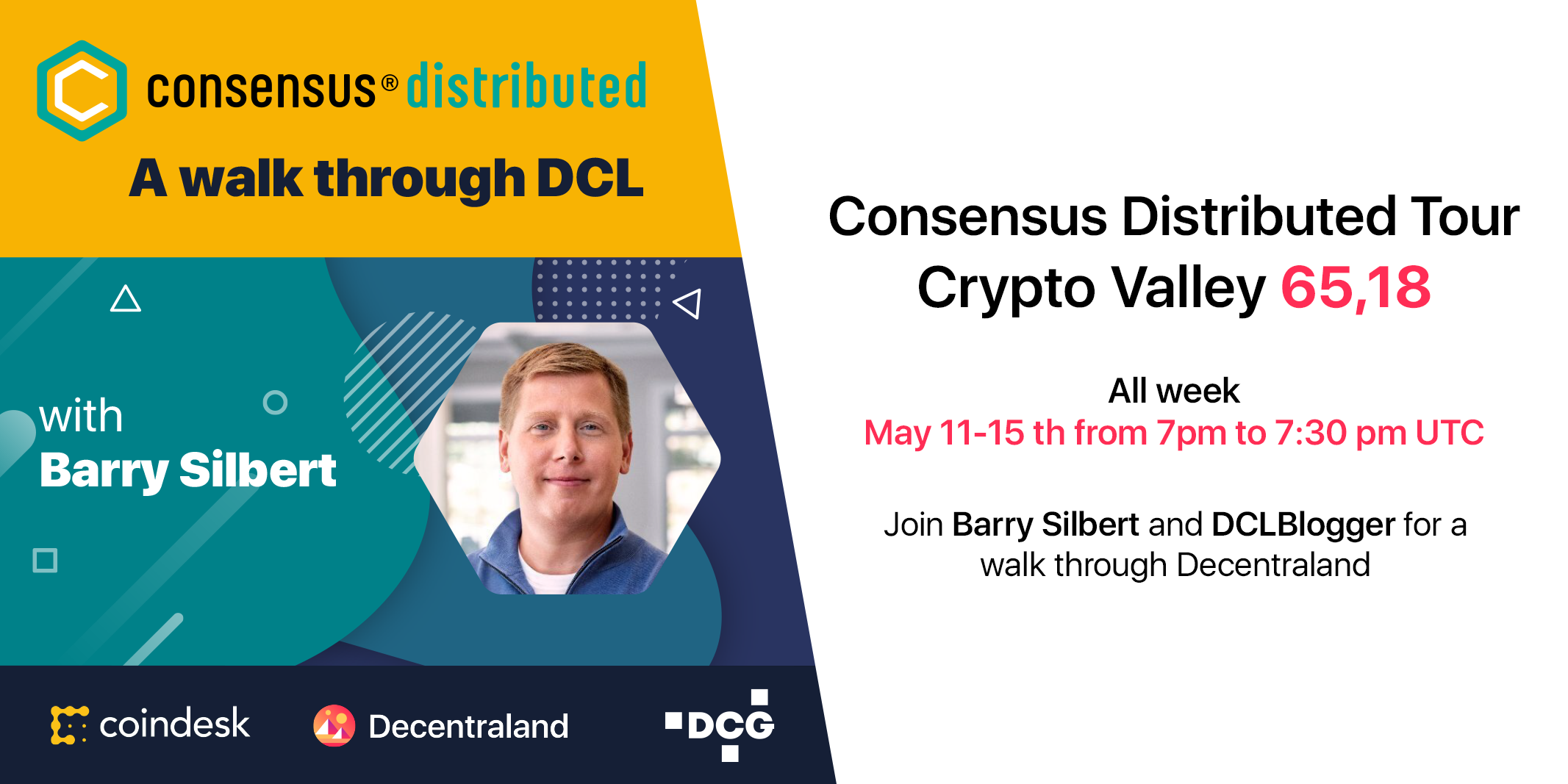 EXCLUSIVE: Join us for a special live walkthrough of Decentraland with Barry Silbert from DCG and Matty - DCLBlogger. 7pm UTC in The Crypto Valley (65,18).