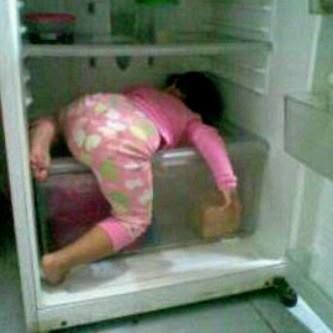 As you can see in this one child and for some reason he fell asleep in the refrigerator cabinet, either because out there the air is very hot and maybe that is the best choice so we can see he is so comfortable sleeping there.