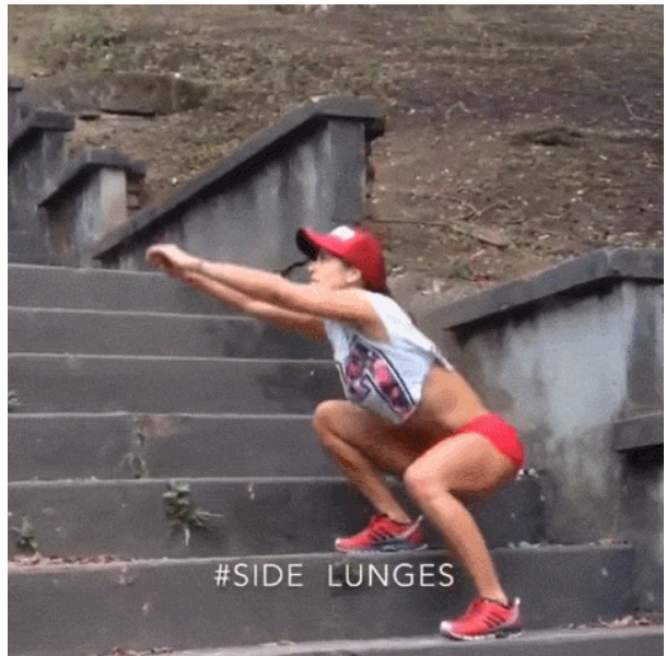 Estocadas Laterales Mínimo haz 15 escalones x 3 repeticiones en cada pierna. No hay mejor ejercicio para los glúteos que este. ¡Sin necesidad de aparatos!